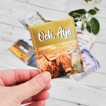 A set of 8 delicious teabags individually packaged in handcrafted sewn paper envelopes, featuring fun Scottish colloquialisms and words with their translations. With each individual envelope design featuring a Scottish word, quote or saying. This is the perfect giftset for someone who loves Scotland – especially if they love tea too! The teas are sourced from well known British tea companies and you have a number of different flavour options to choose from: English Breakfast tea, Tetley's Tea, or a selection of mixed flavours (which includes English Breakfast, Earl Grey, Rooibos, Chamomile, Pure Green Tea, Peppermint and Berry). They smell and taste amazing! Inside each envelope is a flavour tag explaining which tea flavour it contains. Each set comes in a card box gift with clear window to see the teabags inside.