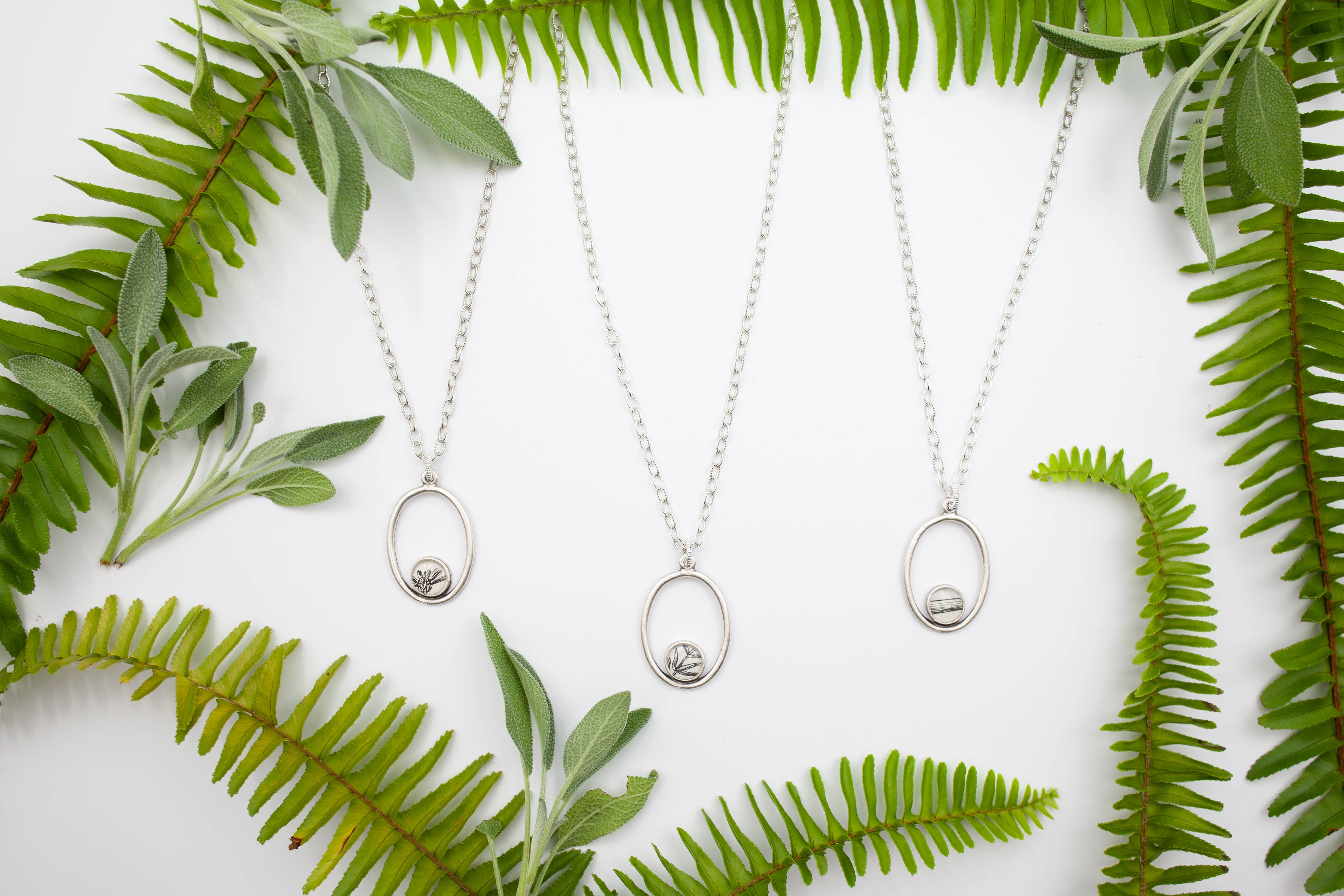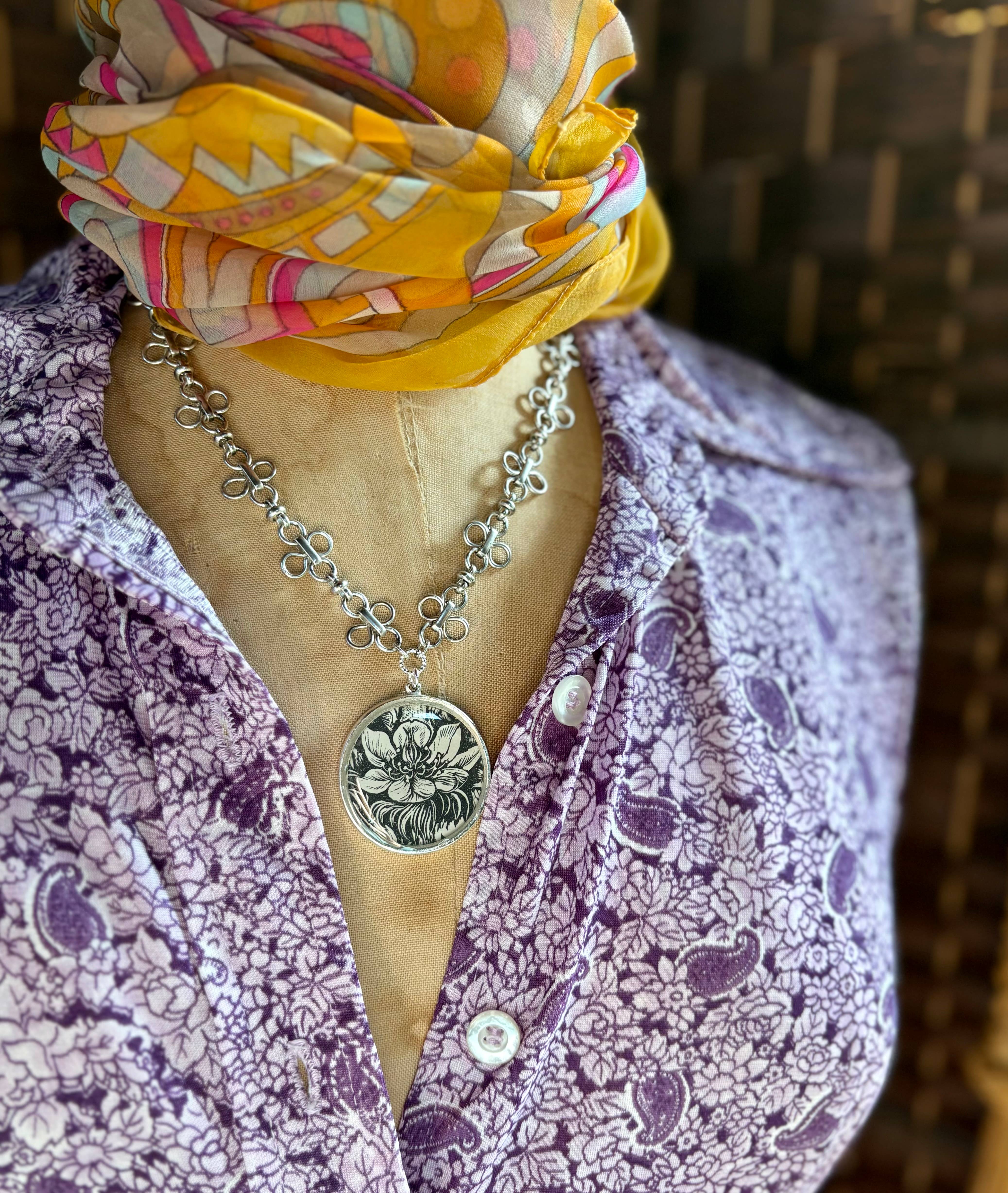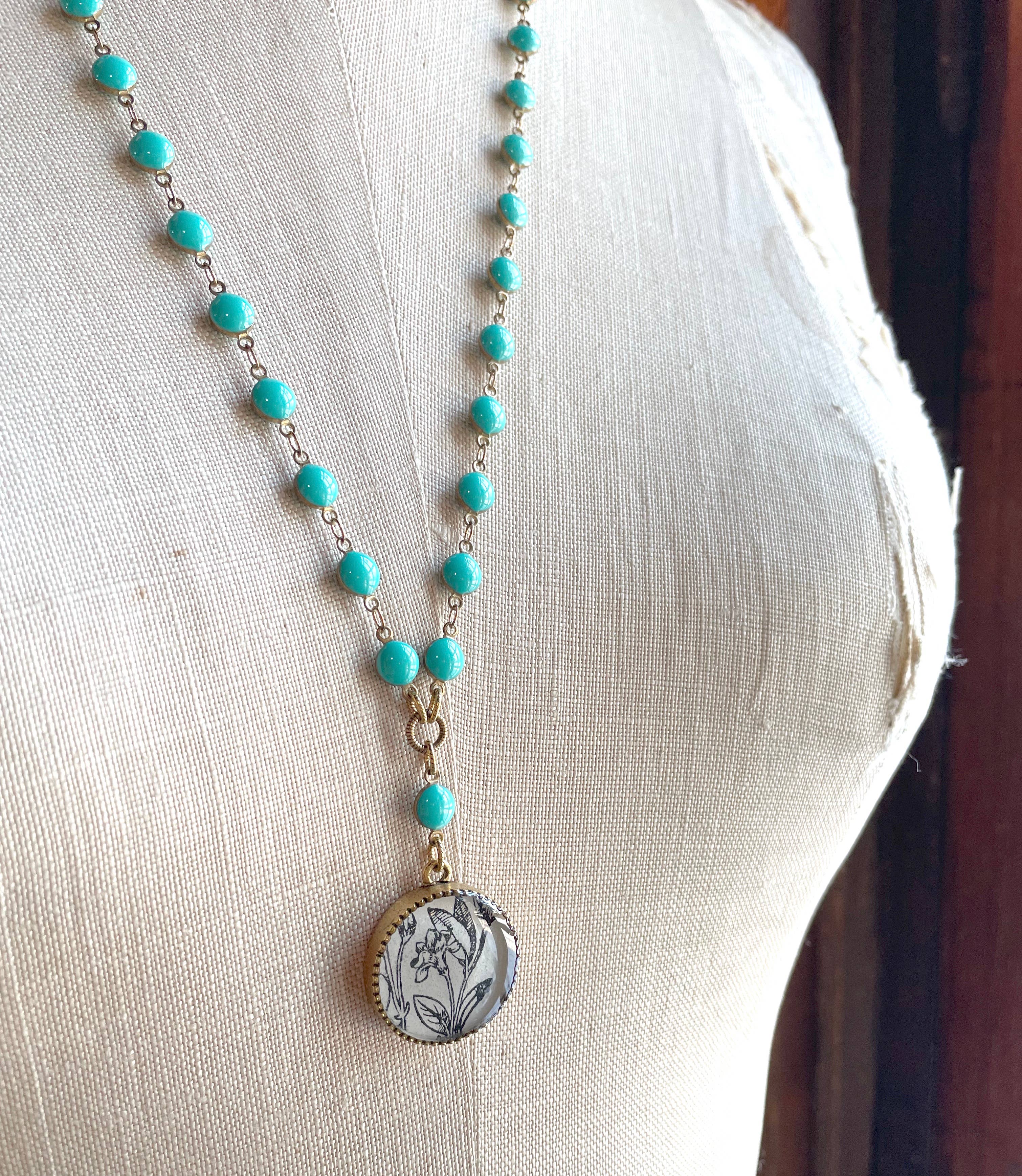 vintage imagery/resin 1.5" silver ox bezel, 11x6mm cobalt ring chain, 18" long. An Art Deco inspired necklace featuring black & white botanicals culled from original vintage paper within a demi crescent shaped pendant. The imagery used is authentic vintage paper from botanical books that celebrates a graphic, deco inspired style. Each illustration is presented in layers of jewelry grade resin that serves to protect and to provide a lovely magnification. A stunning 11x6mm enamel cobalt ring silver chain at approximately 20" top to toe long makes a noble statement alone or serves as a perfect length to layer beautifully with other pieces. Each pendant is one-of-a-kind but will be similar what is shown here. As these are made with vintage materials, due to cropping, each pendant can vary slightly.