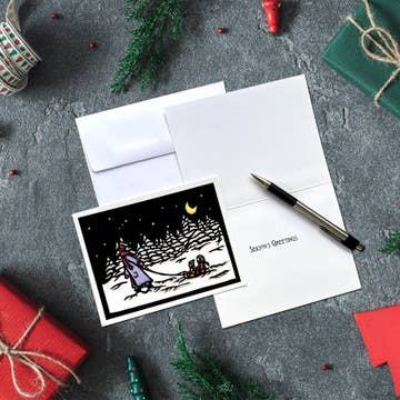 Time for Christmas Cards? NEW! Your Customers will eat up our new packaged collections. Our (8) top selling Sarah Angst Art 5"x7" Blank Holiday Greeting Cards come with envelopes and are packed in a cellophane wrap. Visual postcard with barcode provided. All cards are reproductions of original prints. Perfect assortment for the holidays. Images Included in this Collection: Fox Snow Globe Christmas Critters Owl Crown Christmas Trees Holiday Nutcracker Northern Lights Bears Cedar Waxwings Snoozin' Black Bear NOTE: 8-Packs are sold in sets of three. Wholesale: $12.95 Each Suggested Retail Price: $26.00-$28.00 Each All bright & bold Sarah Angst Art Greeting Cards are printed on Forest Standard Certified (FSC) Paper and are created and Reproduced in Bozeman, Montana, USA - Made in America. **Boxed Holiday Cards without the box!
