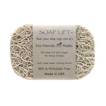 The Soap Lift® is the first of its kind. The Soap Lift rests your favorite bar soap high and dry, lifting it out of standing water so it dries faster and lasts longer! Made from bioplastic and recyclable. Don’t let your soap turn into muck! Soap Lift® is made of a multi-directional bioplastic that allows water to drain and air to circulate. They can be used in soap dishes, on shower shelves, or on countertops. Cleans remarkably well by simply holding it under running water and giving it a few squeezes. Approx. size: 2.75″ x 4.25″. Can be trimmed to fit soap dishes, if necessary. Various colors available!