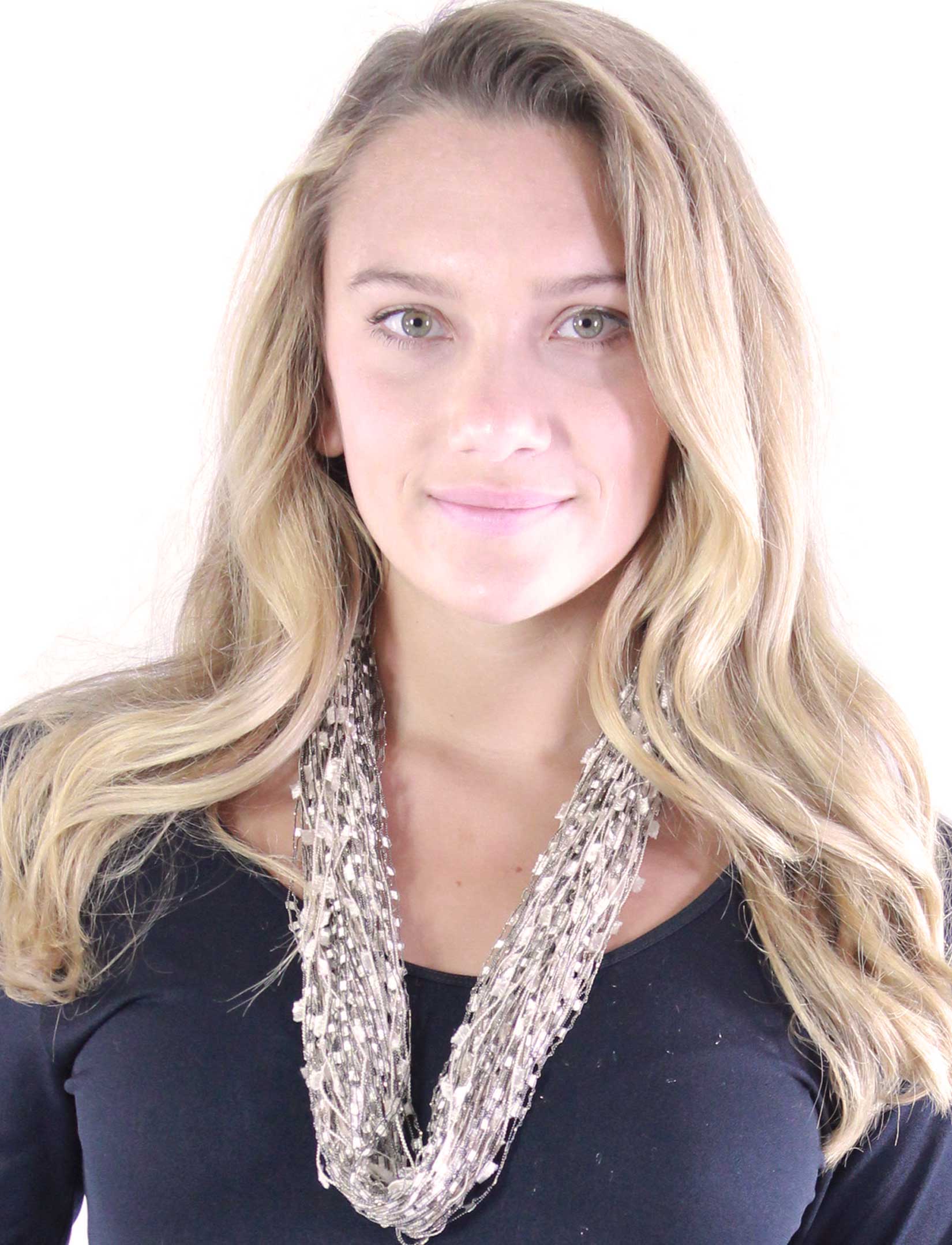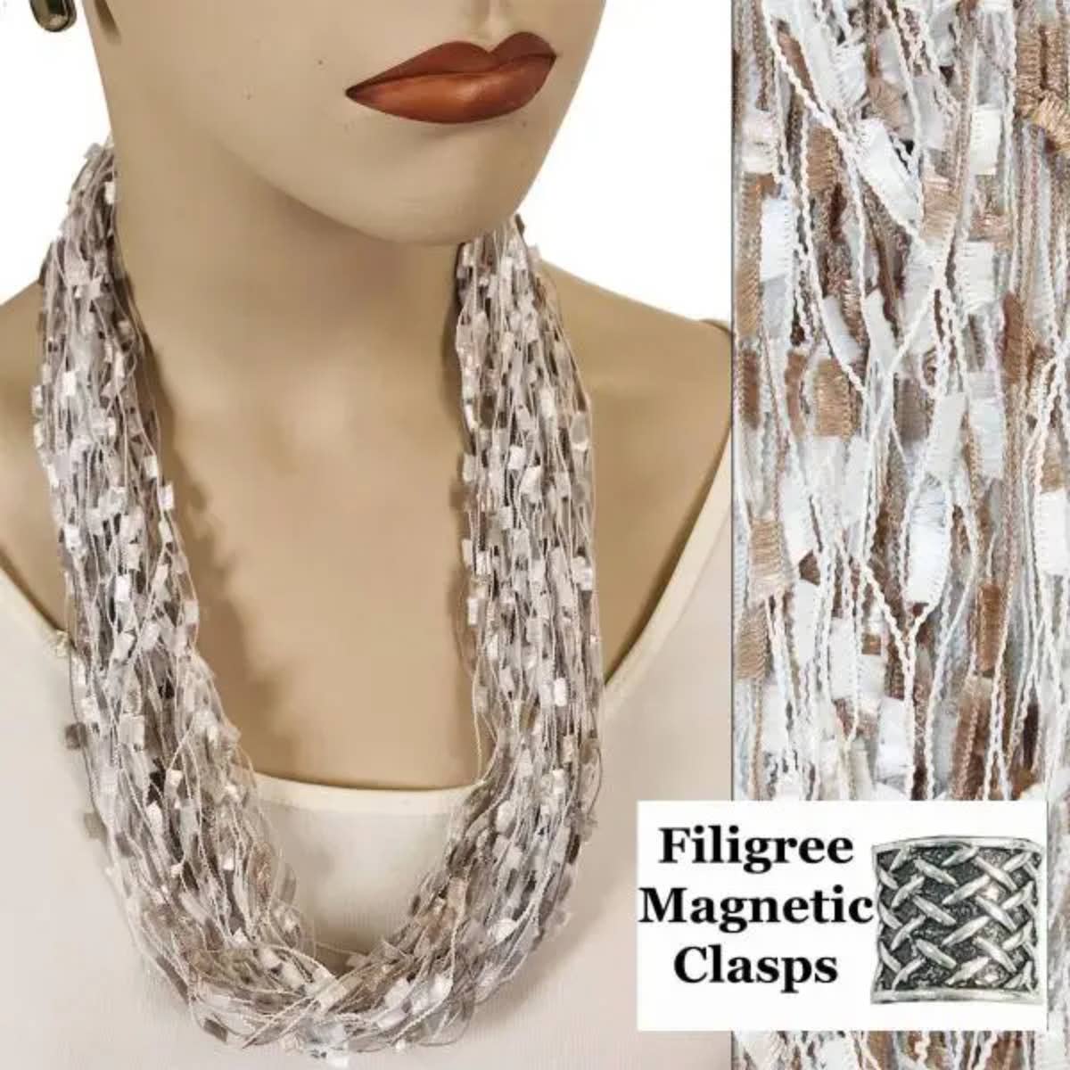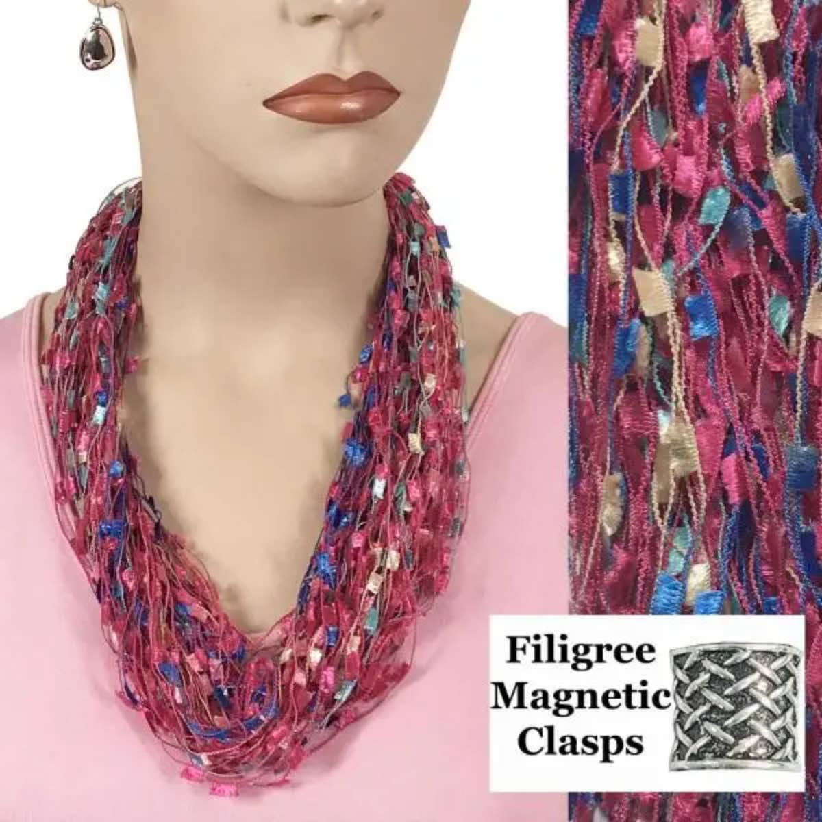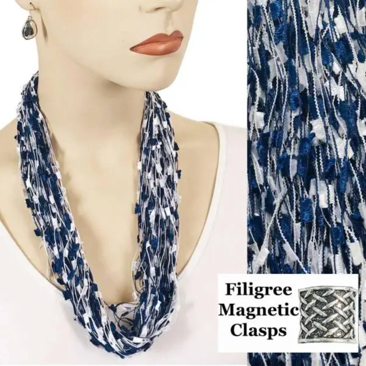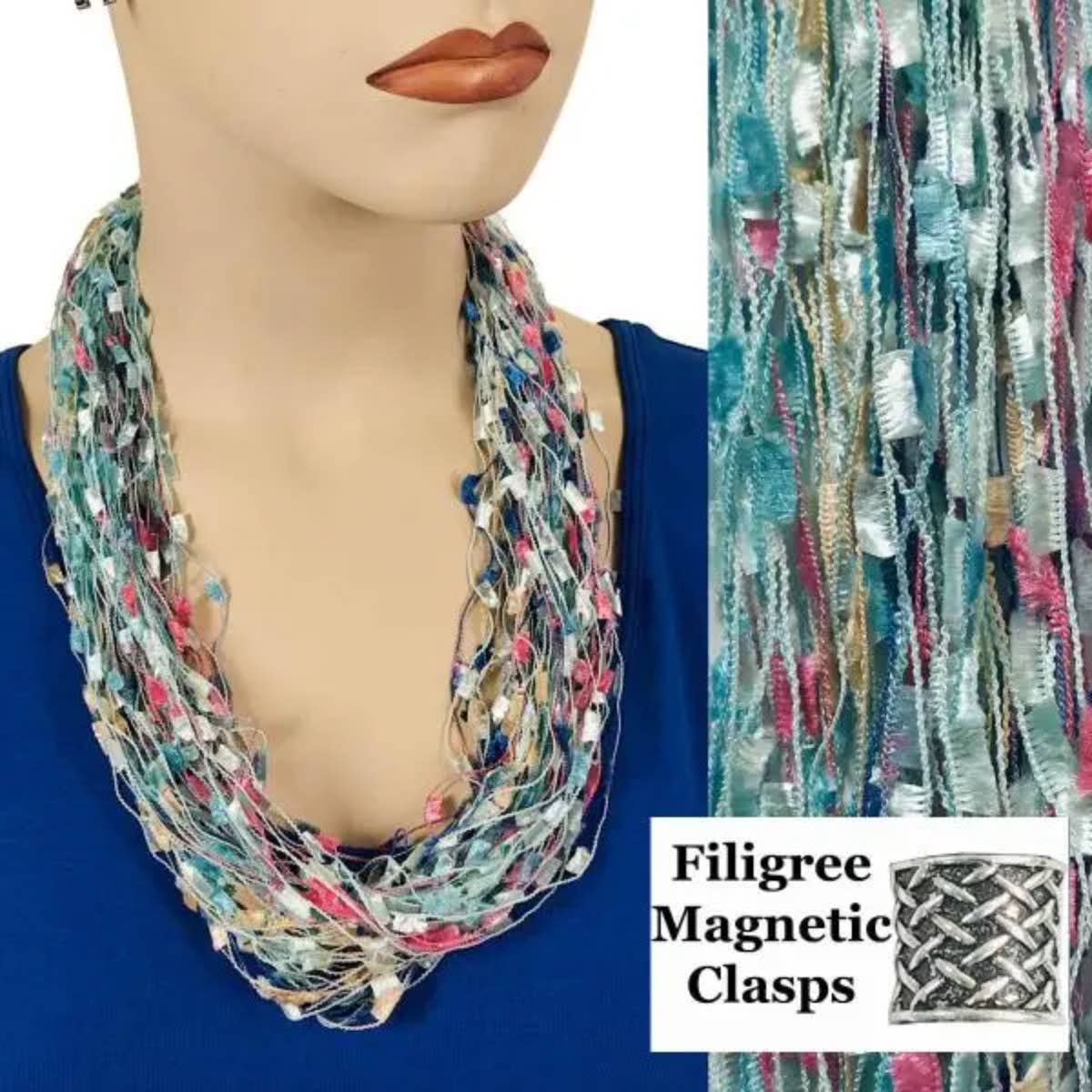 Sometimes an accent scarf is just the thing! But do you sometimes find yourself checking in every mirror you pass to adjust the length and drape of your scarf? If you do, we have a solution. A necklace scarf makes accessorizing fool proof. Our staff assembles these magnet scarf necklaces by hand in Gloucester, Massachusetts with meticulous attention to detail. We utilize the best fabric to create a soft lovely drape and filigree nickel clasps with powerful ceramic magnets to make sure these scarves stay secure around the neck. The result is a single loop infinity scarf that allows you to embellish and enhance but never overwhelm your outfit. You can be stylish and perfect without fussing and adjusting all day long. 28" x 18" Silky Polyester Plated Nickel Materials China Made in USA