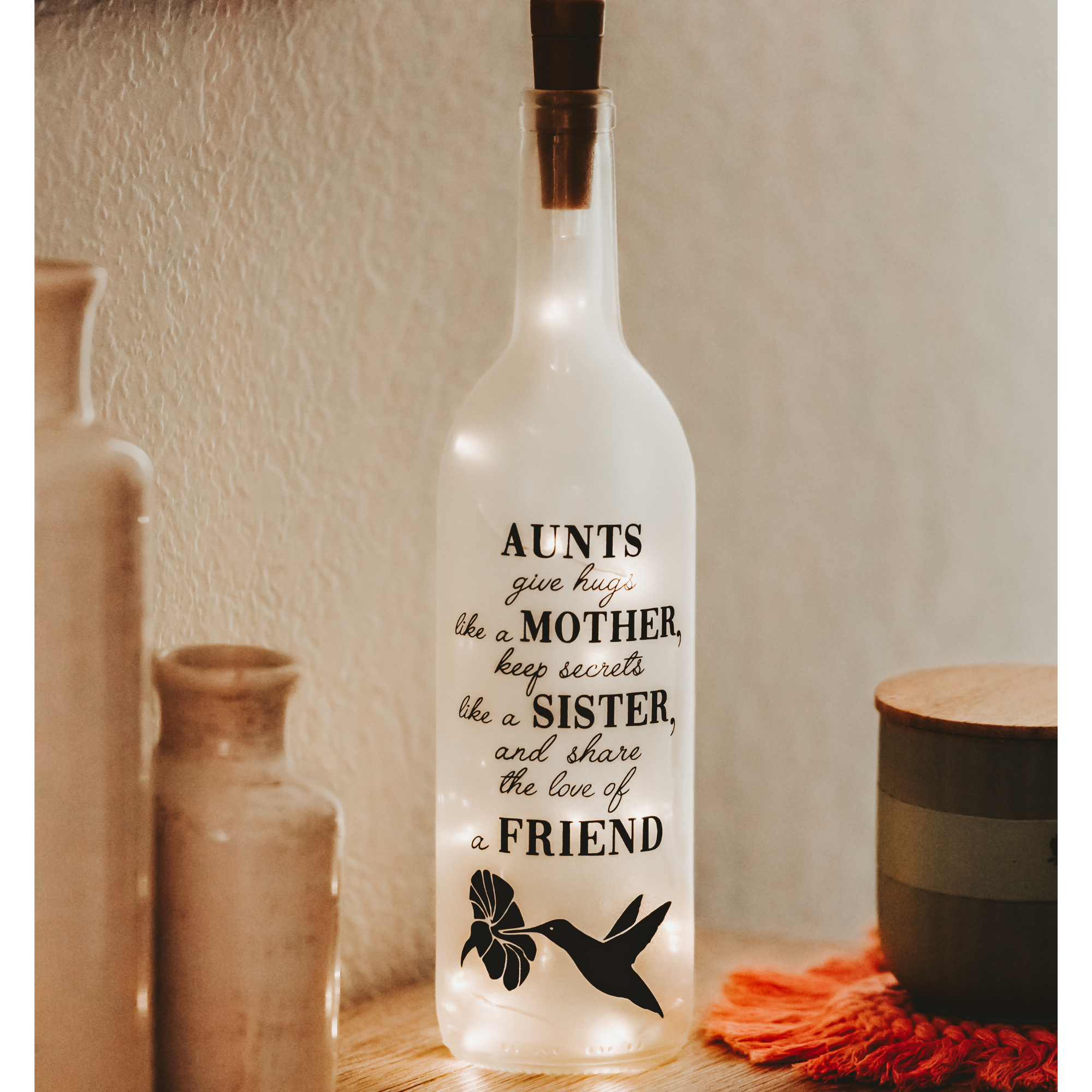 Add a heartwarming touch to your Mother's Day display and gift inventory with our enchanting "Grandma" wine bottle light. These captivating tabletop lamps are a unique Mother's Day gift certain to delight your shoppers, instantly ending their search for the perfect gift for grandma. Materials: -Standard 750 ml wine bottles -Permanent vinyl image is applied by hand -One AAA battery (included) -Plastic cork with lights is secured to the bottle Dimensions: -Approximately 3" wide by 12" tall Customer packaging materials included: -Organza drawstring bags -Care instruction cards -Sheets of 12"x12" bubble wrap Note: Frosted bottles should not be displayed in any way that will allow them to bump or rub against other items as they may scratch.