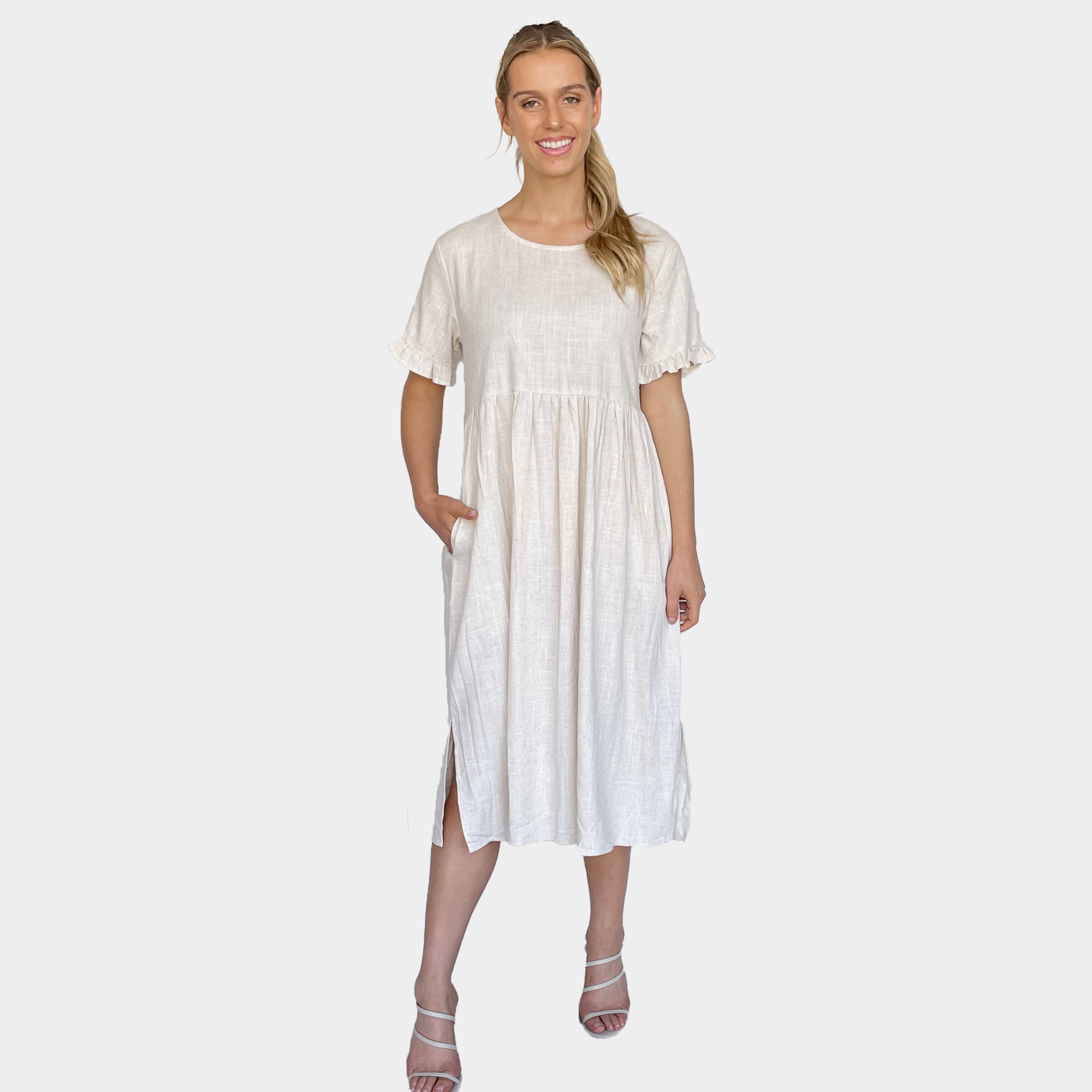 Our best-selling long-sleeved dress in a stunning olive tulip print. We've designed Daphne with a relaxed yet flattering fit, in the ideal length that won't ever feel too short. Perfect for pregnancy, postpartum and beyond, this dress makes all bodies feel gorgeous. Size & Fit * XS/S fits sizes 0-6 * M/L fits sizes 8-12 * Model wears size XS/S Details * 100% Modal * Made in India * Block-printed using AZO-free dyes * Pockets * Tie in back * Slightly longer hem in the back Care Instructions All of our products are designed with an easy-care philosophy in mind. Most of our items can be safely machine washed on a gentle cycle with cold water.