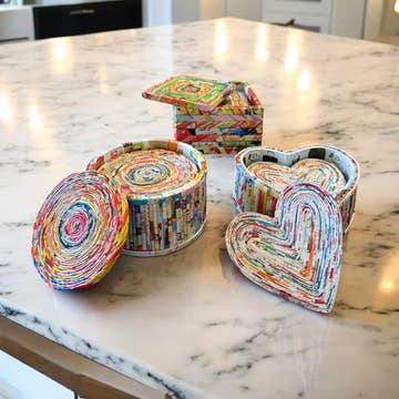 Protect your furniture in style with our eco-friendly coaster sets! Each set includes six coasters, featuring unique designs handmade from recycled magazines in Vietnam. Our coasters are coated with a thin layer of clear coat so water is not absorbed into the paper. Available in round, square, or heart shapes, and complete with a matching holder for easy storage. Each piece in our collection is handmade from upcycled magazines, giving discarded paper a new life as eco-friendly décor. What once would have ended up in a landfill is now transformed into colorful ornaments, recycled paper art, and sustainable home accents. Our artisans roll and shape each strip of paper by hand, creating unique pieces that combine craftsmanship, modern design, and environmental responsibility. Perfect for eco-conscious homes and sustainable gift shops, these designs show how creativity and reuse can turn waste into something beautiful.
