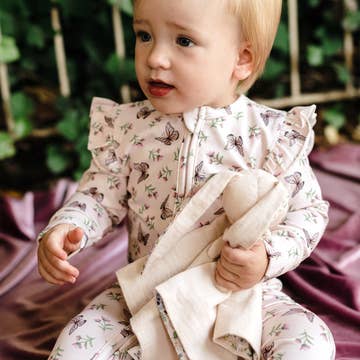 Our Organic Growsuits are an all-in-one onesie that is both functional and beautiful. Soft and stretchy, our growsuits are an easy-care, fuss-free option that’s easy to wear thanks to their modern, fitted style. Suitable for loungewear, daywear, birth announcement photos and make great baby gifts. All Snuggle Hunny clothing is made with GOTS Certified Organic Cotton CU 1182228. Eden is part of our Enchanted Forest collection. Our Growsuit Design This design includes a long, hidden zipper from ankle to ankle, inside the leg. This means bub’s body can stay warm while their nappy is being changed, with simple, easy access. It also means these growsuits are as easy as a T Shirt to put on bub!