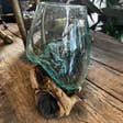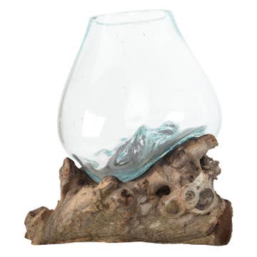 Immerse your living space in the enchanting charm of our Large Molten Glass Bowl With Natural Wood. Designed by Benjamin International, this decorative tabletop object measures 5.5" x 8.5". The juxtaposition of molten glass and natural wood creates a unique aesthetic, making each piece an individual work of art. Whether you're looking to enhance your home decor or searching for the perfect gift, this bowl is sure to impress. Our products are carefully crafted, reflecting our commitment to promoting local artisans and maintaining ethical standards. Hand blown glass on driftwood. Each piece is unique sizes and shapes are an approximate.
