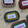 Small pins with words and rhinestones. The back of the pin is made with old postcards from the 1900s. Often, Tezeè uses objects from the past in her creations, giving them new life and reminding us that reuse is important. Very original, lively, and fun, they look great on jackets, sweaters, t-shirts, jeans, scarves, bags, hats, etc. The rhinestones are of excellent quality, and this is the version with two rows of colored rhinestones. Lots of varieties of rhinestones to play with colors!