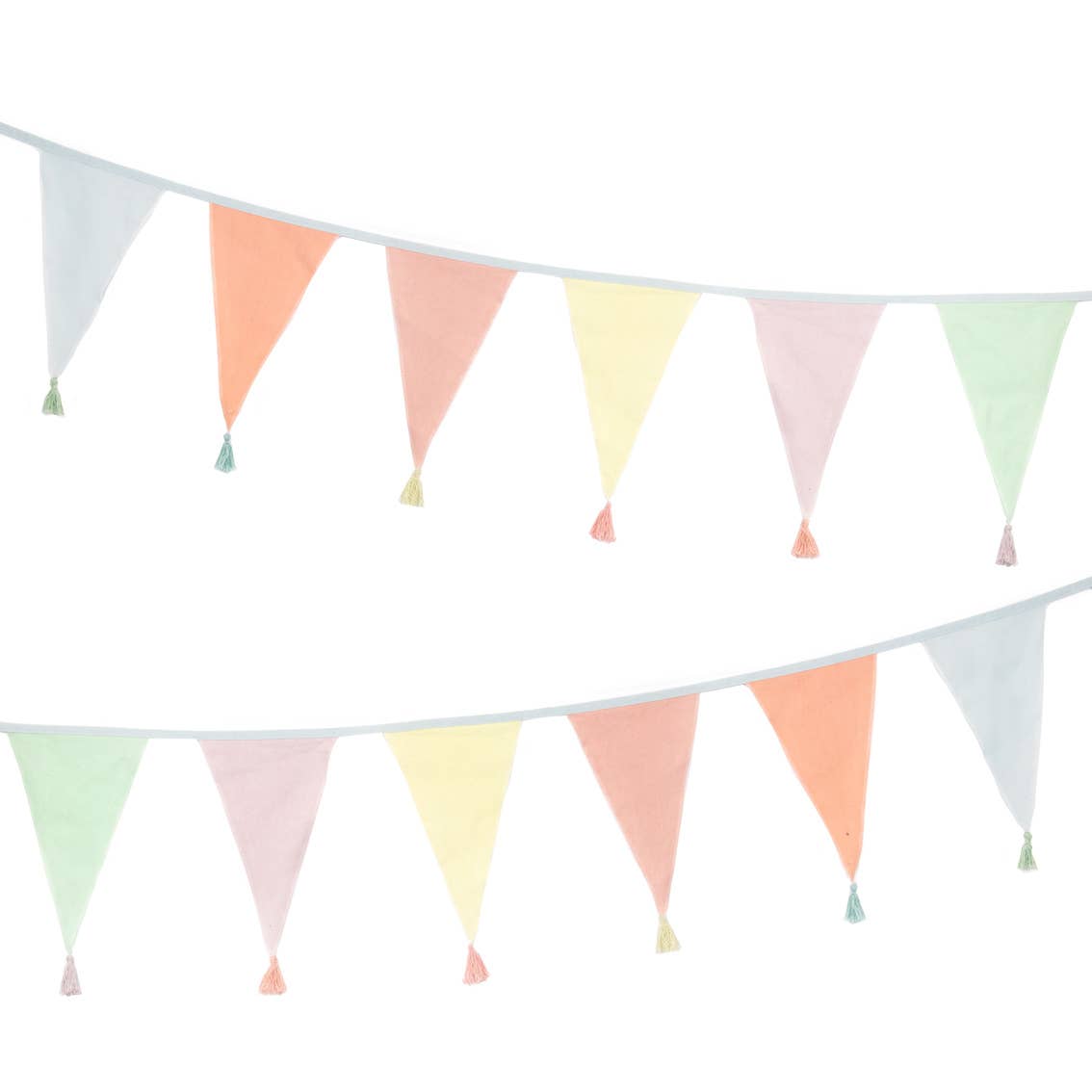 Rainbow Fabric Bunting by Talking Tables. This reusable bunting is handmade from sustainably sourced 100% cotton and has fun tassel detailing on each pennant. Suitable for indoors and outside, use as a decoration for a birthday party, garden party or leave up all year round as home decor in a child's bedroom or playroom. Each pennant is double-sided and can be washed after use for a refresh when needed. Size - 3m (118in) with 12 pennants