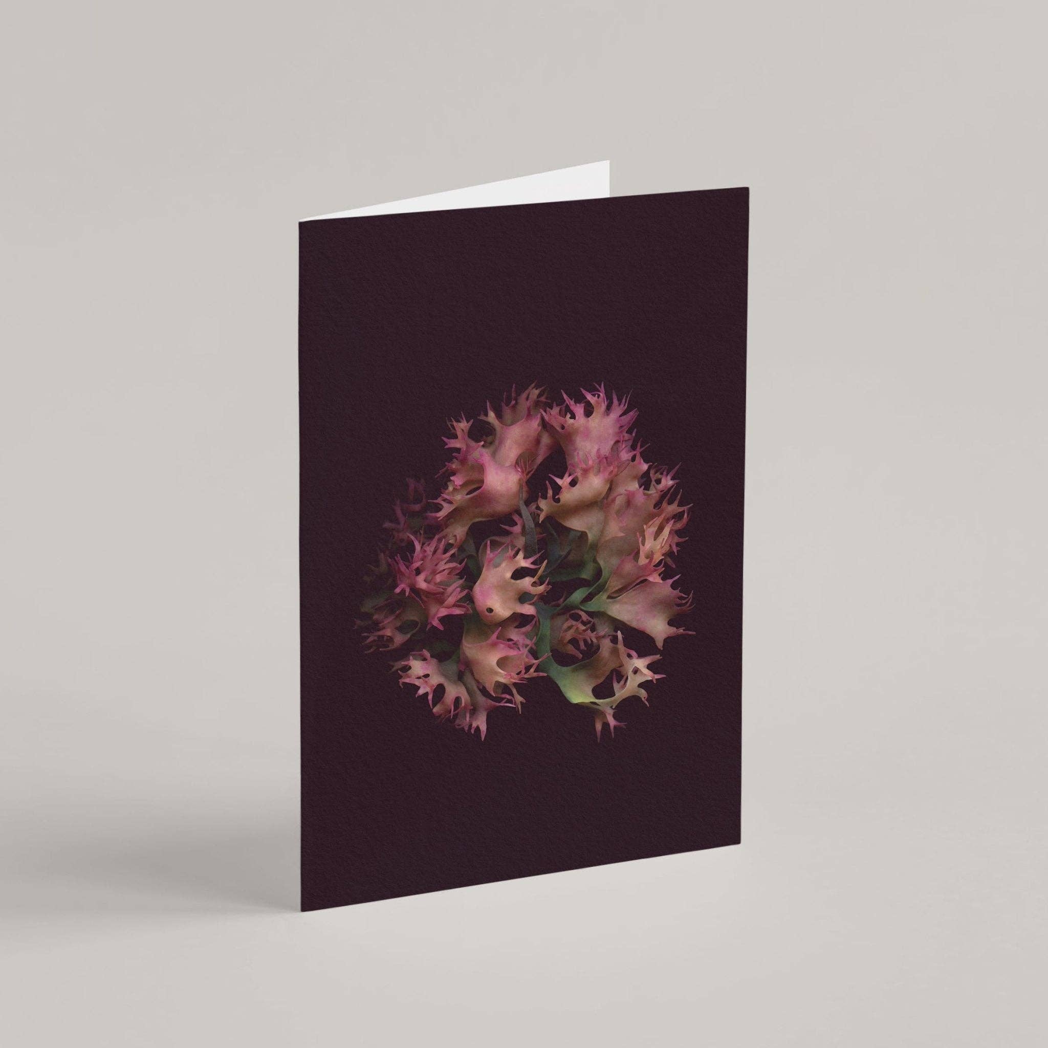 Unique greeting card with botanical illustration, inspired by the coastal flora. Perfect for all occasions. DETAILS • 4.25" x 5.5" (11 x 14 cm) • Blank Interior • Printed on high-quality matte paper 100% recycled • Matching vellum enveloppes certified for sustainable forestry • Individually packaged in a clear cello sleeve • USMCA compliant and duty-free ABOUT THE ARTWORK Chondrus Crispus is a composition from the LIT.TO.RA.LIS Collection, a series offering pictorial poetry giving voice to stranded beauties.