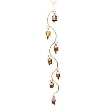 Our curved stem bell wind chimes boasts beautiful gleaming copper bells, each one carefully suspended from the stem at intervals that create a harmonious balance. These beautiful copper coated bells are hand crafted by the Hussein family in northern India. Made from upcycled metal Coated and heated in copper shavings to obtain unique exterior look Tuned by hand to perfection Hangs on metal loop Can be sprayed with a clear coat to preserve color and longevity Size: 5 Bells 18" x 2", 7 Bells 23" x 2" Key words: wind chime, hand made, copper bell, fair trade, garden, home decor, garden decor, gold, spring, summer, patio, rustic, Mother's Day, gift, Father's Day
