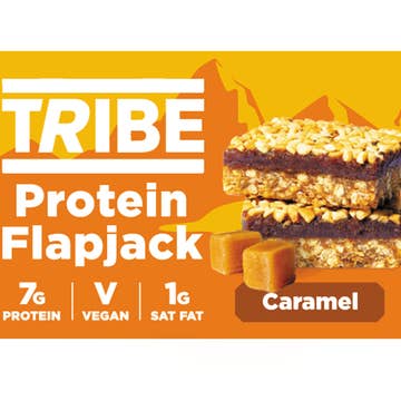 TRIBE Protein Flapjack in an indulgent chocolate hazelnut flavour. With an oaty base, soft date layer and crunchy peanut topping, this flapjack is the perfect pick-me-up! Vegan | Gluten Free | Natural Ingredients | 7g Protein | HFSS-Compliant