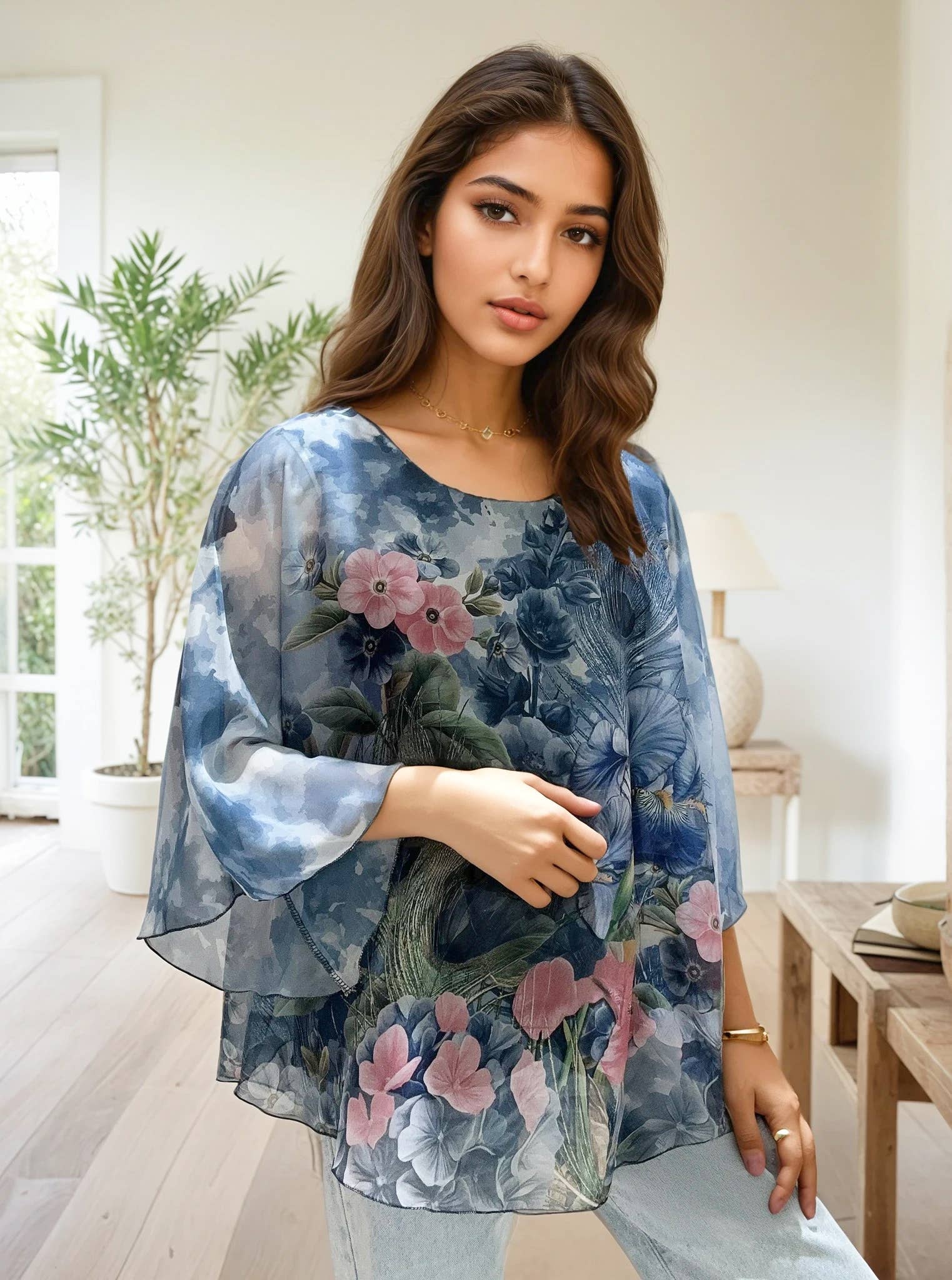 Viscose trousers, straight cut, with bohemian print These trousers offer an elegant and comfortable silhouette. Made of viscose, they are lightweight and pleasant to wear, ideal for hot days. They feature a belt to accentuate the waist and add a touch of style. The trousers have a hip circumference of 105 cm and a length of 120 cm. The trousers fit sizes 36 - 44/46.