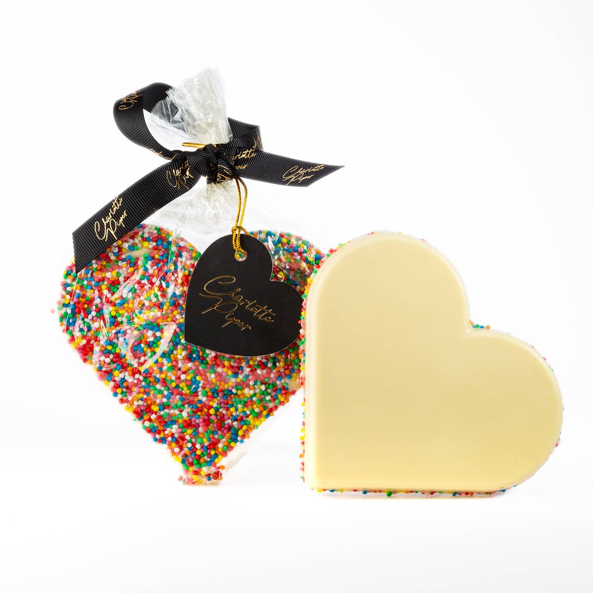 Delicious Smooth Milk Chocolate Heart Shape, Sprinkle with Sprinkles, beautifully presented in cello, tided with a Charlotte Piper Bow and Tag. This carton has 12 packs. GTN Barcode: 19352346002278 Product Barcode: 9352346002271