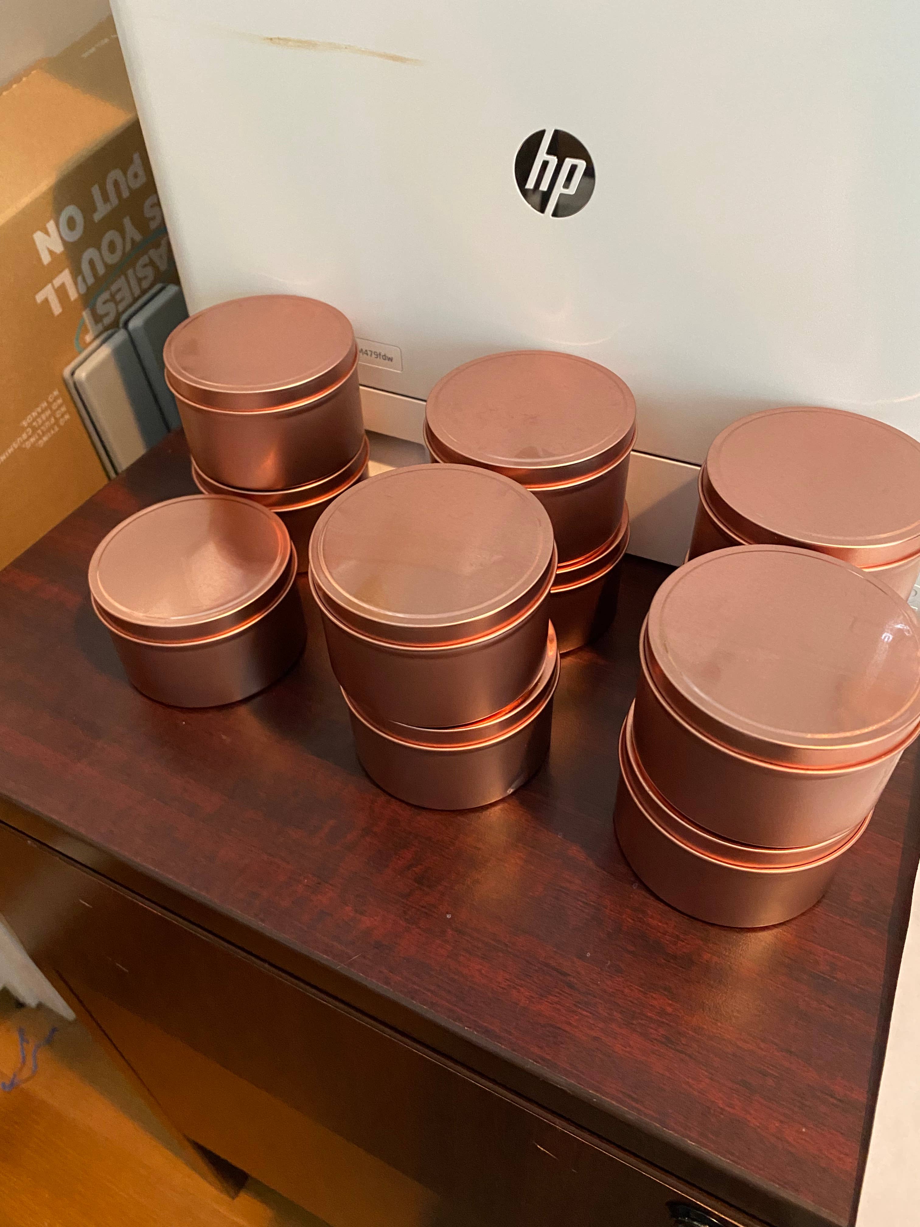8 oz. private label rose gold tin. Save yourself tons of time by purchasing private label. Each tin contains one eco wick, 6 ounces of coconut soy wax, and premium fragrance infused with essential oil. Need a label? We've got you covered. Simply upload your design! Label size is 1" x 4".