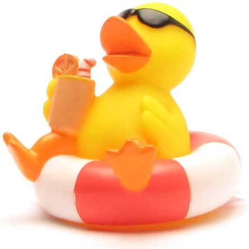 Dive into the world of relaxation with our humorous rubber duck in a red and white swimming ring! This rubber duck is the perfect accessory for anyone who wants to spice up their bath time and bring a bit of holiday flair to their home bathroom. Our charming rubber duck is enjoying her well-deserved vacation and wants to show you how to do it right. Equipped with cool sunglasses and a refreshing cocktail in your hand, it invites you to switch off and relax together in warm water. The special design of this rubber duck is a real eye-catcher and brings a smile to everyone's face. The red and white swimming ring in which the rubber duck relaxes is not only a stylish detail, but also helps the duck float safely on the water. Dimensions: L: 7.5 cm W: 7 cm H: 7 cm Squeak hole: Yes Floats upright: No Material: vinyl Recommended age: For children aged 18 months and over