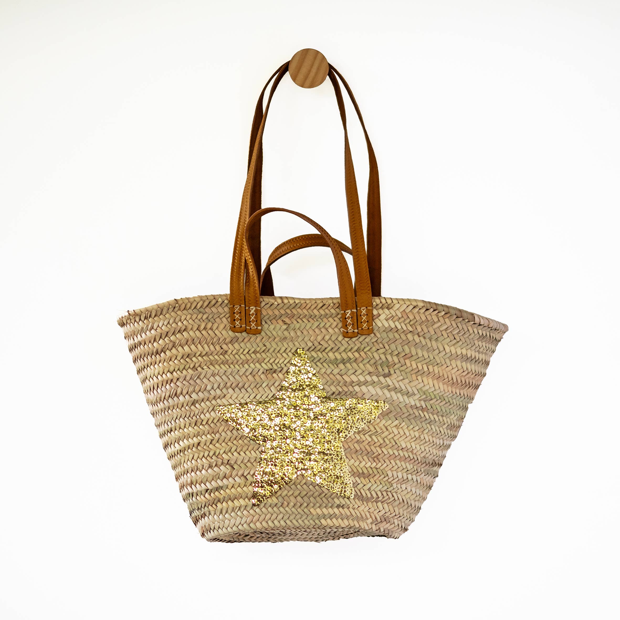 A medium sized palm shaped basket with a thick long leather handle (70cm). This basket is approximately 32cm high, 28cm long at the base and 50cm across the top opening. Strong with a double woven rim and base for a more durable basket. Handmade from sustainably sourced date palm leaf and leather. All baskets come with a sewn on 2 duck brand leather label.