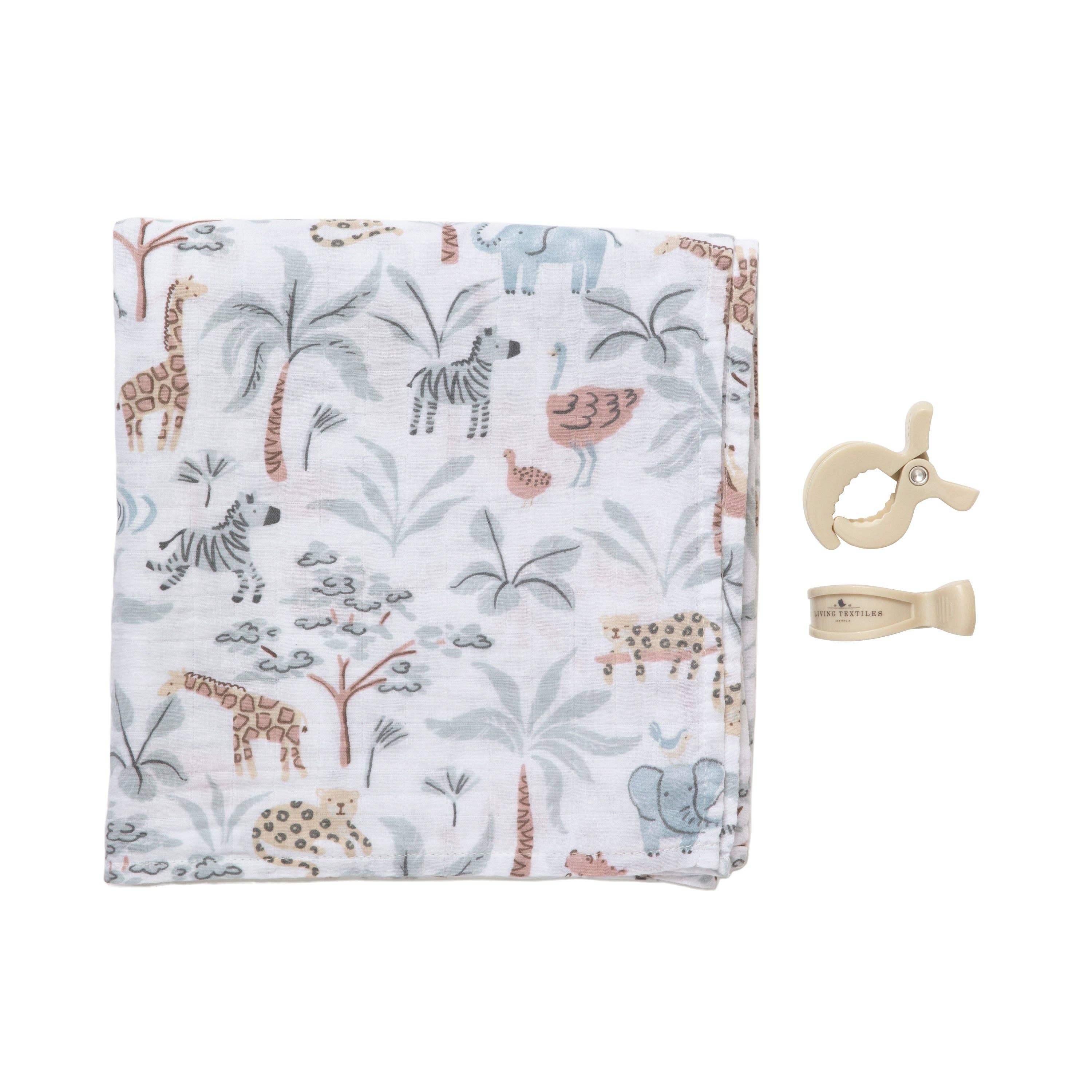 SKU: MC380065 Made in China Care instructions: Machine wash Occasion theme: Baby shower and Everyday Pattern: Animal print Season: Core Product language: English Fabric: Muslin 100% Cotton Pram Clips Plastic Weight: 250 g (8.82 oz) Dimensions: 25 x 15 x 10 cm (9.8 x 5.9 x 3.9 in)