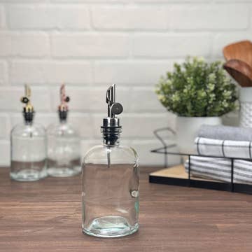 These classic 16-ounce clear apothecary style glass bottles with weighted rubber or cork pour spout adds a touch of sophistication and style to any kitchen. This versatile bottle holds an ample amount of oil, vinegar, or any other cooking liquid. DETAILS: *16oz clear glass bottle *Multiple pour spout options to choose from with either a cork or rubber base *BPA and Lead Free *Removable weighted pour spouts keep the contents contaminant free *Easy to remove for quick filling and easy hand washing MEASUREMENTS: *Bottle with spout: 3"w x 8"h CARE: *We do not recommend using this for soaps or thicker liquids. *For maintaining your pour spout, hand wash with a mild soap and warm water regularly. *For the rubber spouts, after washing, rinse in cold water so it will retain its rubber memory. *Hand wash only Also available in amber and vintage green.