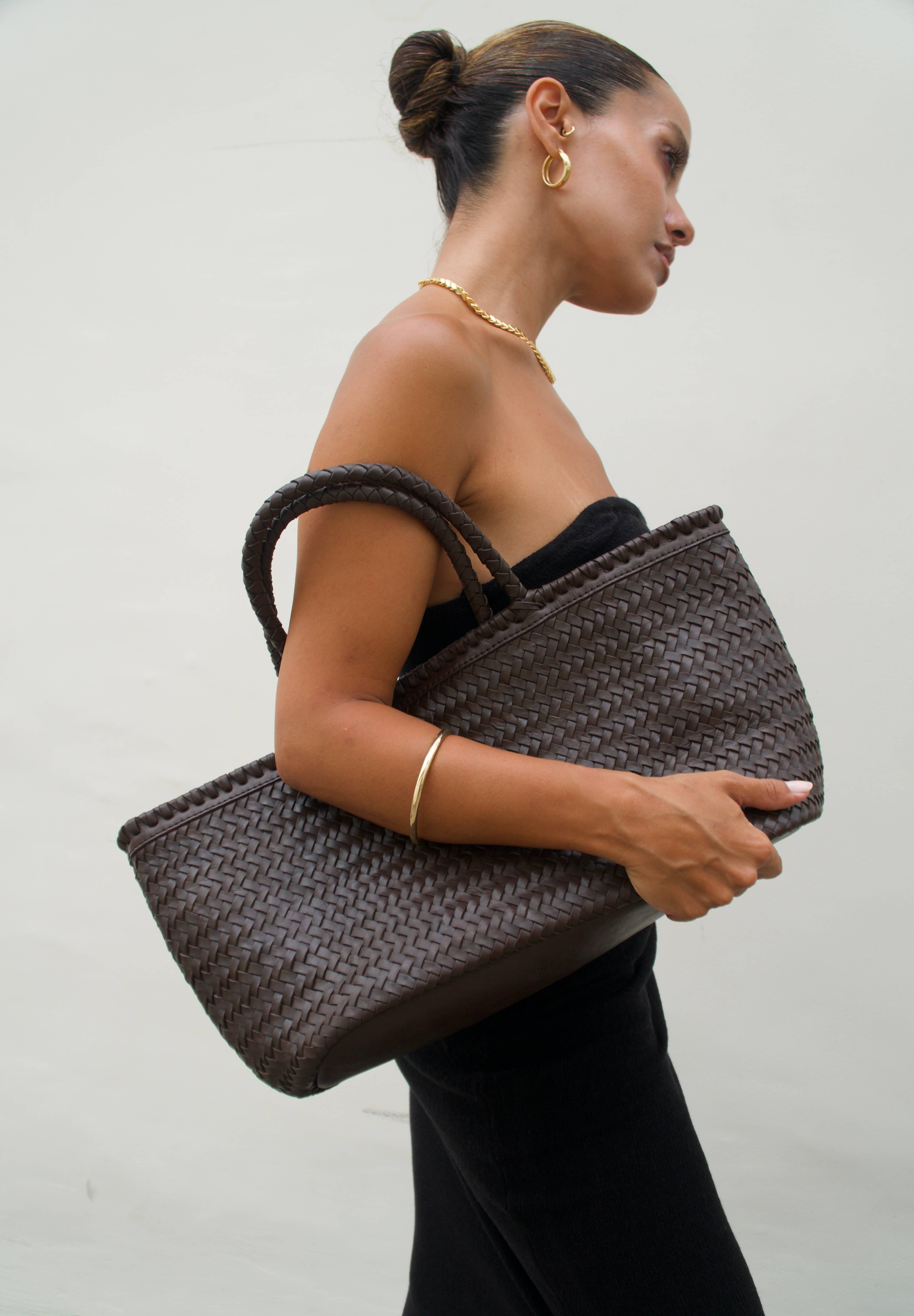 Handcrafted in Bali, the Arvela Woven Leather Shopper combines elegance and practicality. Made from genuine leather, its deep brown hue adds a timeless touch to any outfit. The intricate woven texture enhances its artisanal appeal, while the spacious interior provides ample room for your daily essentials. Featuring sturdy handles for comfortable carrying, this bag is the perfect blend of durability and sophistication. Additional Information: - 𝐌𝐚𝐝𝐞-𝐭𝐨-𝐎𝐫𝐝𝐞𝐫: This product is handcrafted after receiving your order, with production typically taking 2-3 weeks. - 𝐍𝐨 𝐋𝐚𝐛𝐞𝐥: Comes without any label, making it ideal for customers who wish to sell it under their own brand. - 𝐅𝐫𝐞𝐞 𝐒𝐡𝐢𝐩𝐩𝐢𝐧𝐠: Enjoy free shipping on all orders from our bags collection. Made in Bali, Indonesia - Material: 100% Genuine Leather - Color: Dark Brown - Dimensions: (Bottom L) 30cm x (Top L) 56cm x (H) 31cm - Handle Drop: 30cm