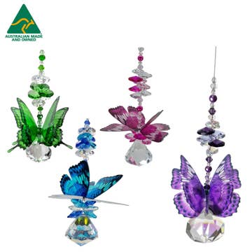 Medium-sized butterfly suncatchers, handmade with a 30mm x 40mm clear crystal diamond ball prism. The butterflies are also handmade in a variety of popular colors. Each order will have a mix of pink, purple, and blue. Larger orders will have a greater variety of colors. SHIPPING- (outside of Australia) I use Australia Post for all shipments. International shipping can be expensive. If you have a query, please send me a message and request a quote before ordering. Your order can also be adjusted down if the Faire cart shows a higher price. LEAD TIMES- Everything is hand-made to order by me (Danielle). I do not have staff. My designs are NOT mass-produced. They are unique and of the highest quality. Lead times will vary based on the size of your order and the seasonal time of the year. Please allow 1-2 weeks' handling time for your order to be made.