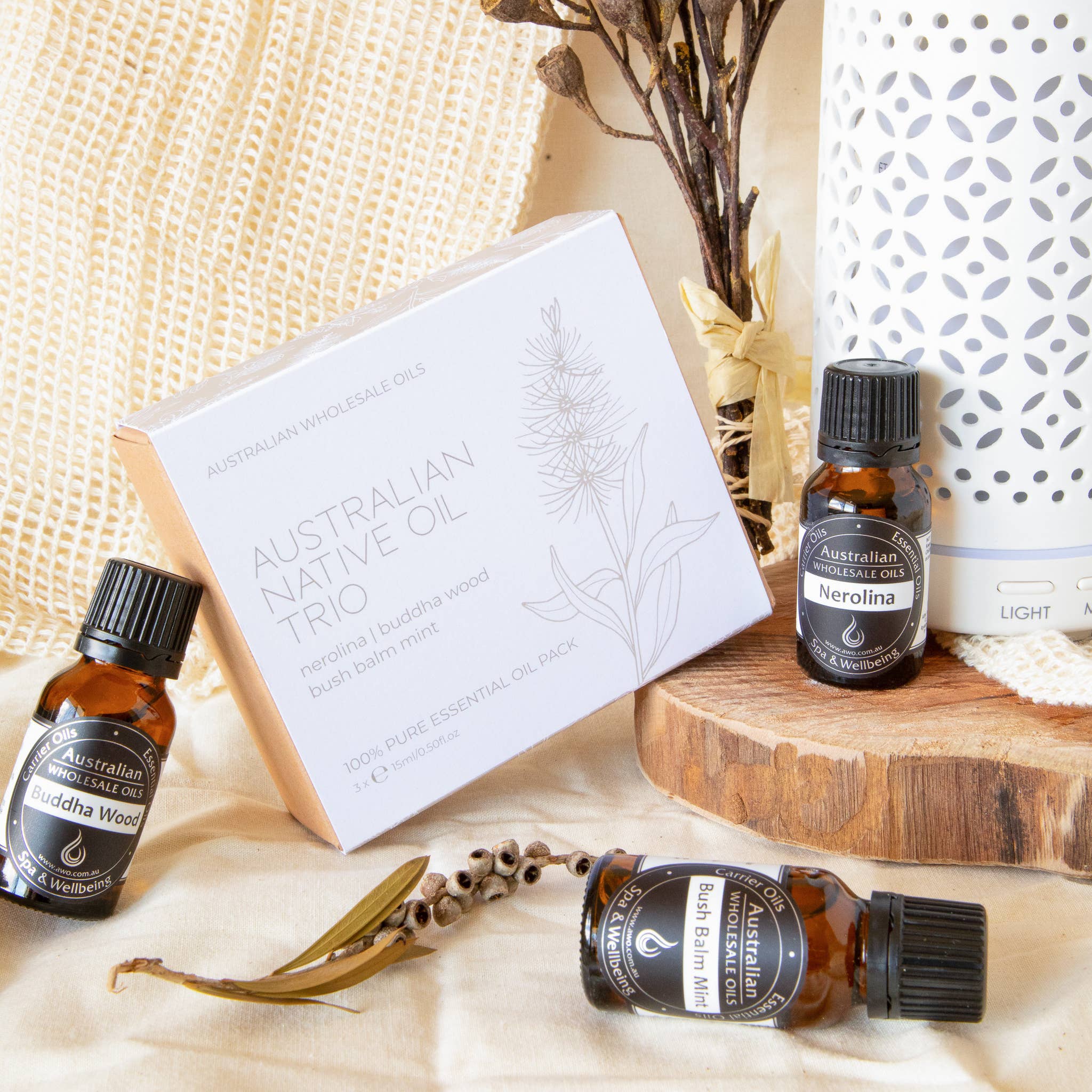 100% Pure and Natural Essential Oil Blend using Australian Botanicals AWO’s Outback Essential Oil Blend is uniquely 100% Australian, proudly formulated using only native botanicals grown, sourced and extracted in our beautiful homeland. Inspired by our Aussie outback, this bushy blend exhibits antibacterial properties that will cleanse and refresh the air around your home. With native scents of Eucalyptus, Lemon Myrtle and Kunzea, Outback will bring the outdoors inside With a pleasant aroma combining notes of Lemongrass, Rosemary and Lavender, our Away blend is sure to become your new best friend when it comes to keeping those pesky bugs at bay - the natural way! Ingredients: Backhousia citriodora (Lemon Myrtle) Oil, Eucalyptus polybractea (Blue Mallee) Oil, Kunzea ambigua (Kunzea) Oil, Agonis fragrans (Fragonia) Oil, Prostanthera melissifolia (Bush Balm Mint) Oil, Callitris intratropica (Blue Cypress) Oil