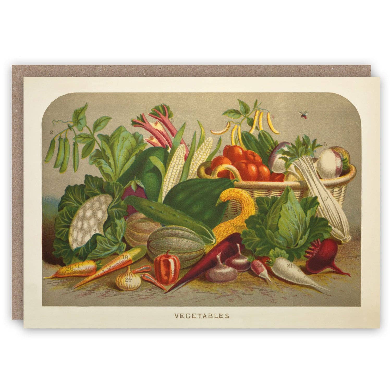 Vegetables greeting card. Printed in England on an uncoated, light cream 300gsm Italian paper, which is recyclable, biodegradable and FSC certified. Adapted from Vick’s Flower and Vegetable Garden, published by James Vick, c.1875. Key on reverse of card. All our greeting cards are 170mm x 120mm (approx. 5” x 7”) and blank inside, individually wrapped in a compostable wrapper made from plants, with a 100% recycled, 110gsm kraft envelope.