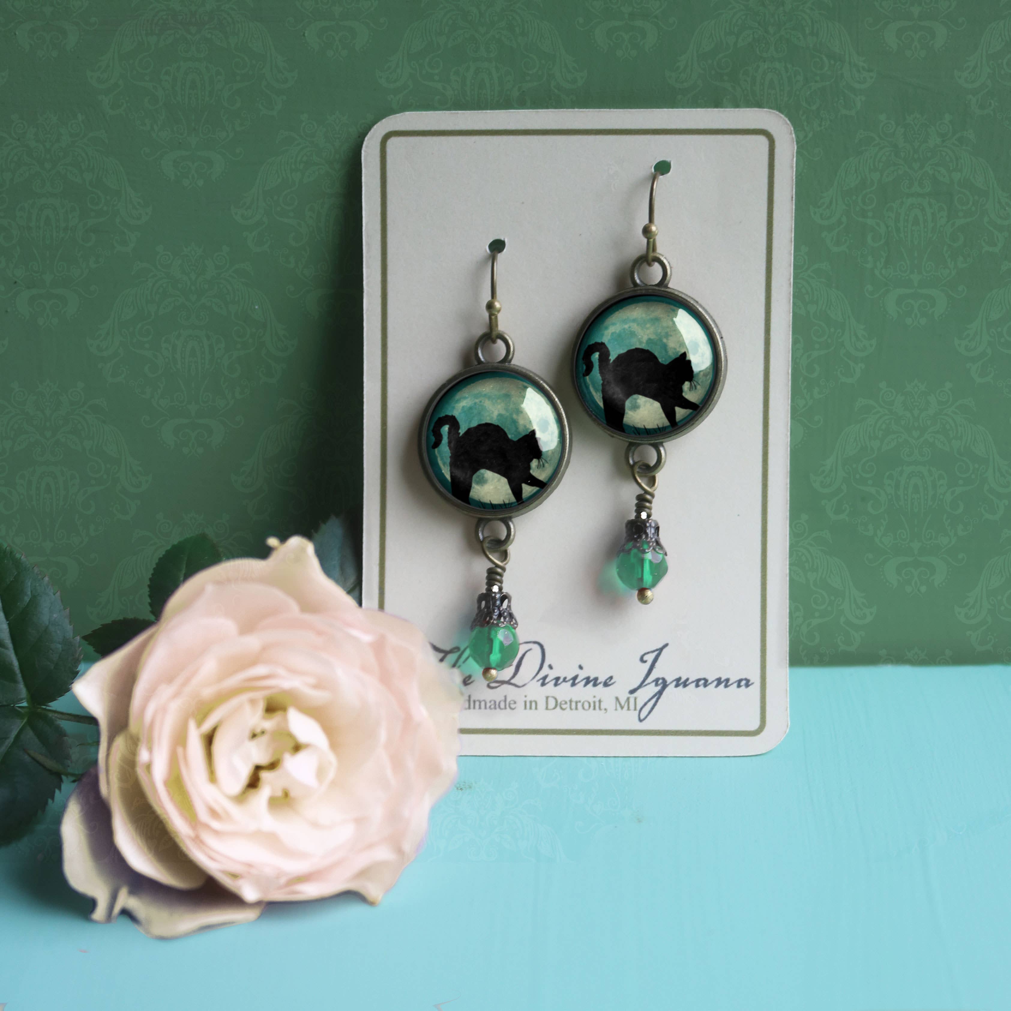 Teal Cat on Full Moon Ornate Oval Halloween Pendant Necklace