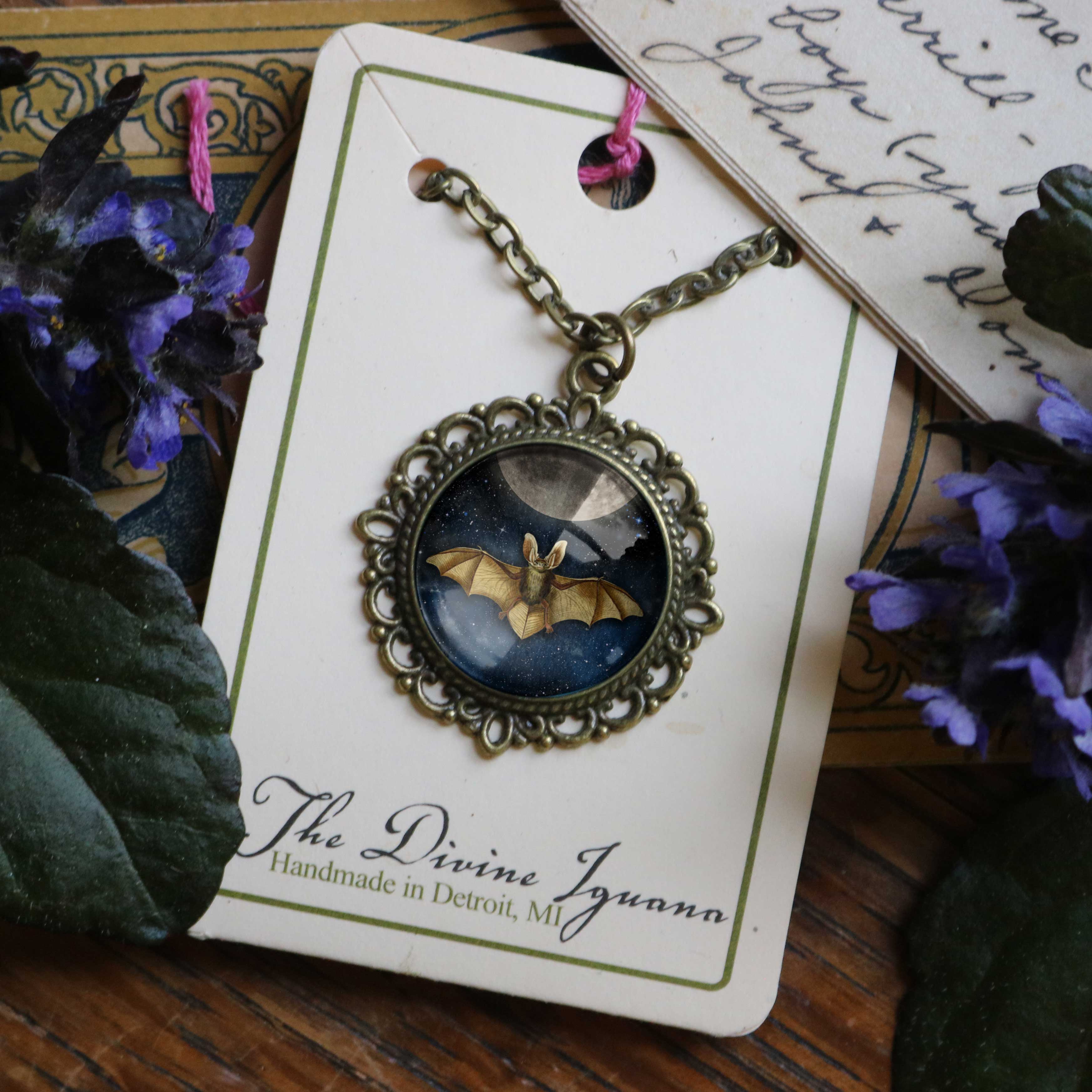 30 x 40mm large oval glass cabochon reverse decoupaged with an original image by Rena Hopkins of the Divine Iguana. Pendant is set into an ornate antiqued bronze bezel on a sturdy 18" long bronze chain with adjuster chain and finishing bead. Pendants ship with both a hang tag AND a chipboard gift box for versatility in display. They have a bit more weight than the rest of the line and look luxurious both in their boxes or hanging.