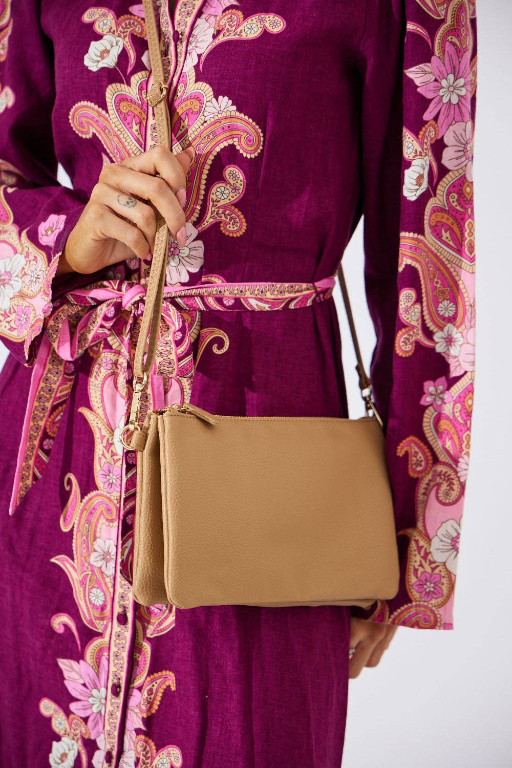 •Sleek, compact, and sophisticated crafted from high-quality pebble vegan leather, our Filomena Crossbody is a must-have. Designed with polished gold-tone embellishment and decorative pressed studs, open the magnetic snap to reveal a non-lining sizeable interior to stow your wallet, keys and lipstick. A convenient exterior back slip pocket will keep your phone within arm’s reach. The Filomena Crossbody bag is slightly structured and has a removable and adjustable buckle strap. You will love this style! •POCKET: Exterior features one back slip pocket •Measurements: 5” W x 6.75” H x 2.5” D •Adjustable and removable strap: Extends to 23”