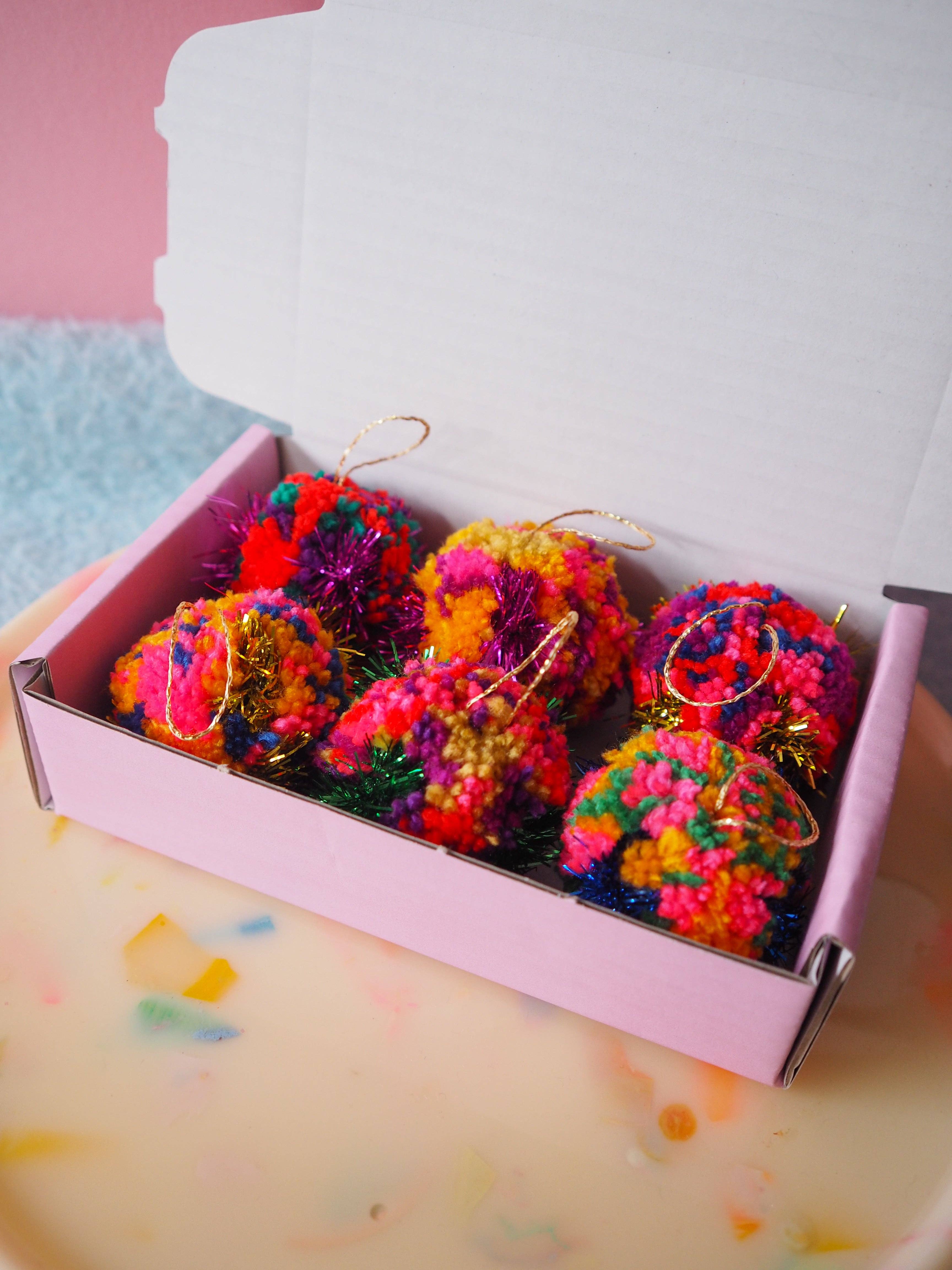 Handmade Pom Pom Bauble made by hand in our studio in Margate, UK making each one truly one of a kind! What will I receive? A handmade Pom Pom hanging ornament made from Acrylic yarn Pom Pom decorations are the perfect item to create a fun and exciting atmosphere in a room. Perfect for attaching to your Christmas tree as a modern and exciting statement touch, or hanging as a garland over the fireplace. - Handmade in UK - Vegan Friendly - Nice & Lightweight Shipping & Returns Most items are handmade to order so please allow 1-2 weeks for dispatch. If you need an item sooner please email via ‘Contact Us’ and we will do our best to accommodate.