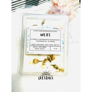 A sampler pack of all my current wax melts! Each wax melt has a specific intention and is curated for that intention with herbs, a crystal chip, fragrance and reiki. They are soy, vegan, non-toxic and contain no chemicals from prop 65 list so it is safer for you, your family, and your pets! Each cube measures 1 1/4" x 1 1/4" x 1/2" and weighs approximately a half ounce. You get one sample cube of each scent: Clarity - Peppermint and Eucalyptus with chamomile, green tea, and quartz chip Adore - English Garden with rose petals and garnet chip Lunar - Moonflower Nectar with rose petals and moonstone chip Awakening - Cactus Flower and Jade with calendula and lapis lazuli chip Cleansing - White tea with lavender buds, cedar leaf, and quartz chip Uplift - Citron and Mandarin with chamomile and citrine chip Protection - Rosemary Sage with cedar leaf and obsidian chip Lavender Sage - Lavender Sage with lavender buds and amethyst chip Current seasonal scents also included.