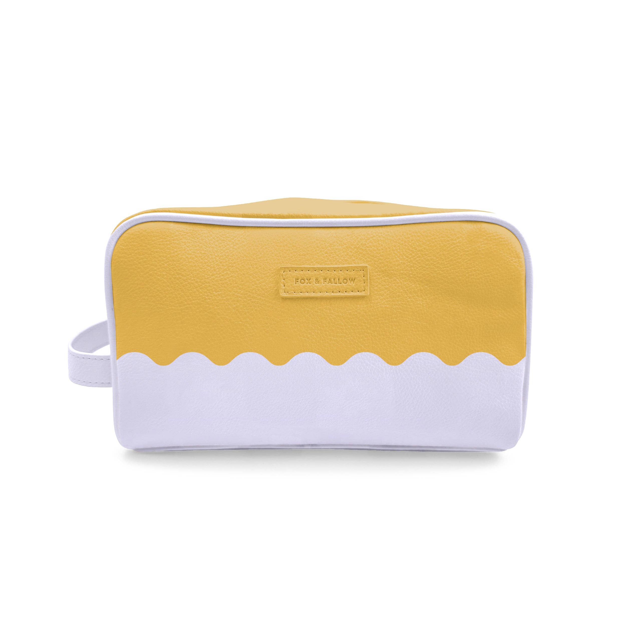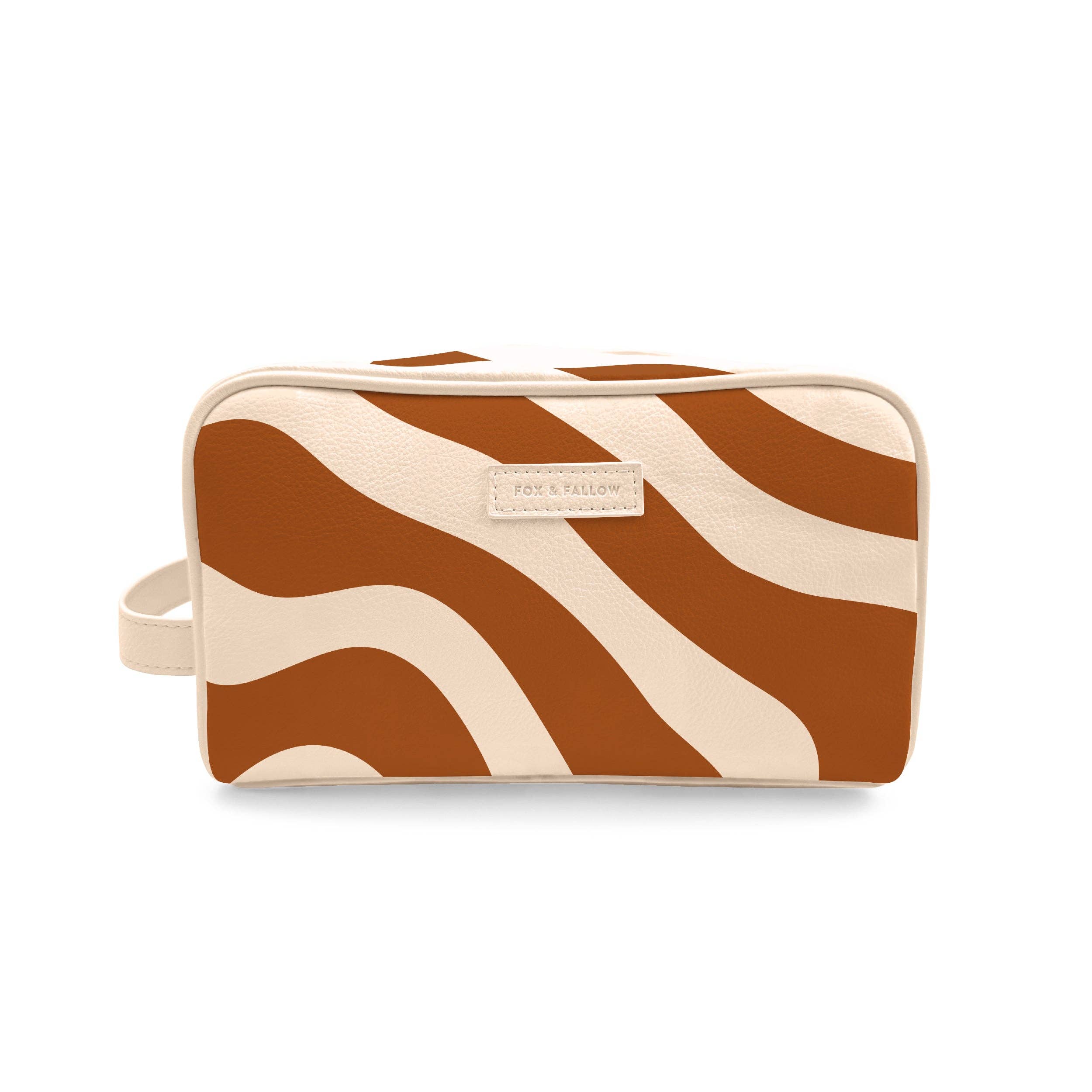 Introducing the coolest toiletry bags you've ever seen! Crafted from super soft, yet durable luxury pebble vegan leather it's easy to keep clean - simply wipe down with a damp cloth. Medium: 25 x 10.5 x 14.5cm. Pebble vegan leather with a tan lining. Internal zip pocket. Gold hardware. Two outer pouch pockets. Handle. Gold zipper. Packaged with a diecut gold foiled swing tag. Designed in Australia, made ethically in China.