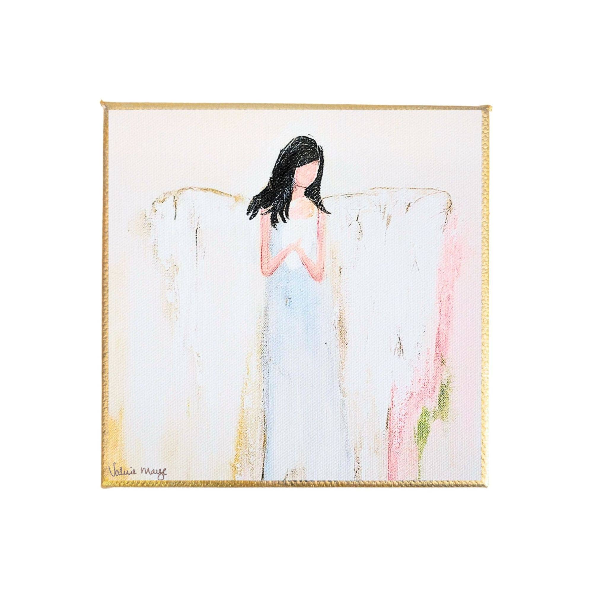 This elegant mini canvas reproduction features the artwork "The Holy Family" from Louisiana artist, Valerie Marze. Transform your space with our charming mini canvas reproductions! Measuring 4" x 4", these canvases boast hand-painted gold edges and a back hanger for easy display. Whether on bookshelves or in compact spaces, these canvases bring a dash of sophistication to every corner. Turn your home into a mini art gallery with these gorgeous reproductions! All our mini canvases are printed in Shreveport, La, embodying a commitment to quality and craftsmanship. Canvases measure 4" x 4" x 1" and are fitted with a sawtooth hanger. Key Words: Artwork, Art, Canvas, Wall Art, Small Decor, Artist, Gold, Bookshelf, Religious, Christian, Christmas, Nativity, Baby Jesus, Easter, Neutral, Holiday, Winter, December
