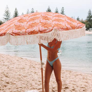 Vintage Dune beach & patio umbrella with cotton-polyester blend canopy will be perfect accessory and stylish shade for romantic picnics, beach days, sunny days on your patio or great addition to your outdoor events! Enjoy sunny days with premium Wind & Sea portable umbrellas. Unique designs with nature in mind, lightweight natural wood frames and a quick and easy assembly. FEATURES * Reclaimed timber laminated wood pole. * Built-in integrated anchor. * UPF50+ water-resistant premium cotton-polyester blend canopy. * Cotton fringe. * Matching carrier bag. * Removable canopy can be easily washed or replaced. * Tiltable on the angle pole for the perfect shade. SPECIFICATIONS In Use: 7'5" H x 6' W / 226cm H x 180cm W In Carry Bag: 45" L x 8" W x 8" H / 114 cm L x 20cm W x 20cm H Pole diameter: 1.25" / 3,2cm Weight: 8.8lbs / 4kg Materials: laminated natural wood pole, cotton fringe tassel, premium cotton-polyester blend canopy & matching carrier bag, fiberglass rib