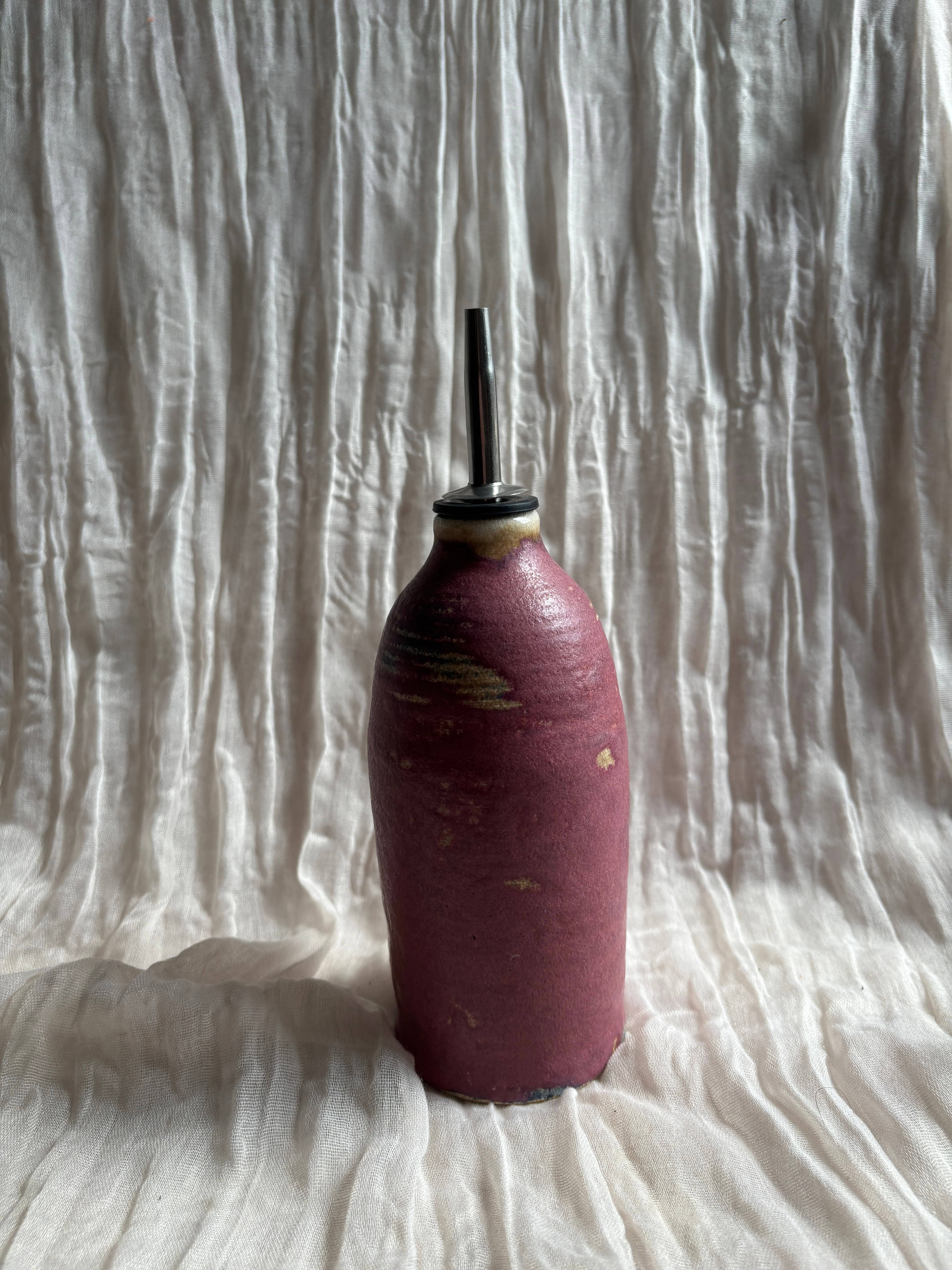Handmade ceramic oil bottle, with a cork top, in our Stripe glaze design. Each piece is unique and will have different markings within the glaze which are to be embraced. Dimensions approximately 13cm tall without the stopper 250ml capacity Care Ceramics are fired to 1260 degrees and therefore are suitable to be microwaved or washed in a dishwasher. How it is made All ceramics is handmade in my pottery studio in Berkshire, UK. The pottery is made in small batches of around 30 pieces and if carefully formed over a two day period. After the pieces have dried for a week, they are then fired to 1000 degrees Celsius in my kiln. I then mix my glazes from powders before dipping and pouring the ceramics to create beautiful glaze patterns. The ceramics is then fired again to 1260 degrees Celsius.