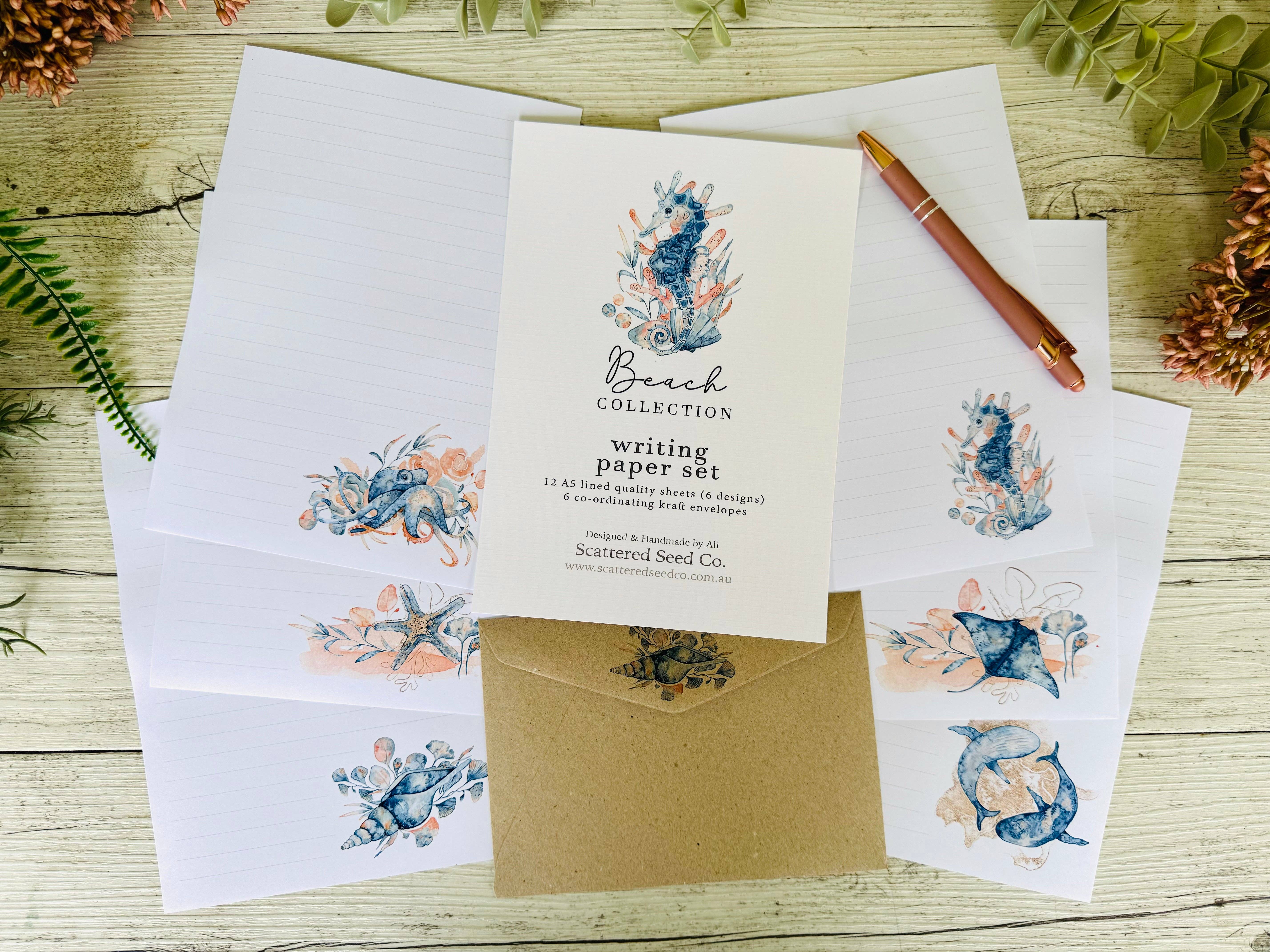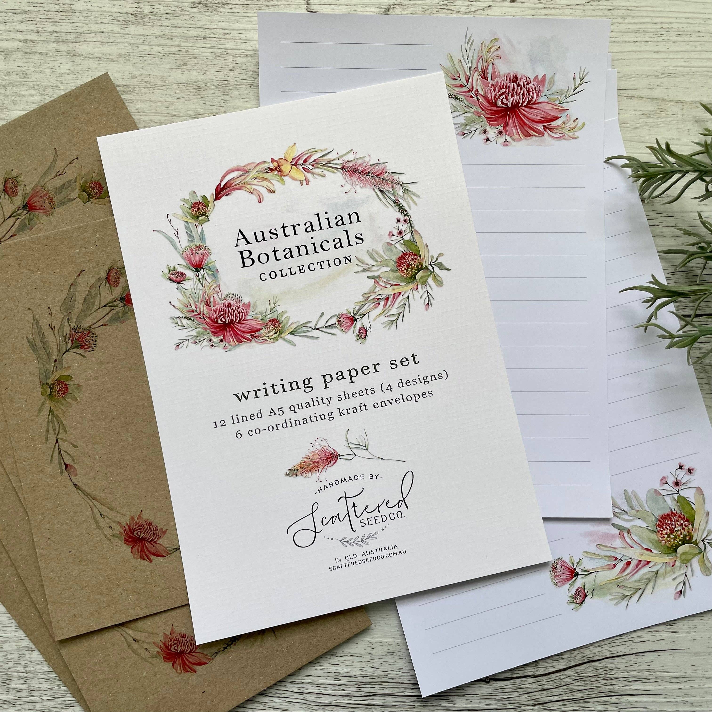 This Australian Birds Collection Writing Paper Set includes: * 12 quality A5 lined writing sheets in four designs * 6 recycled kraft envelopes with co-ordinating eucalyptus printed on back flap OR * 12 quality A5 lined writing sheets in four designs * 6 recycled kraft envelopes with co-ordinating eucalyptus printed on back flap All prettily packaged ready for gift giving in a cello bag. All parcels are sent carefully packaged in stiff cardboard mailers to ensure safe delivery. When you purchase from Scattered Seed Co, you won't be disappointed.