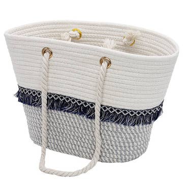 Two Tone Fray Trim Thick Wavy Braided Woven Boat Beach Tote Bag -Double Top Rope Handle: 10" Drop -1 x Open Main Compartment -Bag Dimensions: 15" * 9.5" * 4.5" (Base: 9") -100% Acrylic -CA Prop 65 Advisory