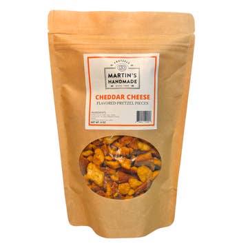 Delight your customers with Martin’s Handmade Cheddar Cheese Pretzel Pieces — a savory snack with rich, creamy cheddar flavor in every bite. Made from our authentic, hearth-baked pretzels, each piece is coated in a bold, cheesy seasoning for a gourmet snacking experience that stands out on any shelf. Key Features: 1.) Bold, Cheesy Flavor: Packed with the irresistible taste of real cheddar cheese — a must-have for cheese lovers. 2.) Premium 8oz Bags: Generous size and excellent value for retail displays, grab-and-go sections, or gift baskets. 3.) Handcrafted Quality: Made from Martin’s signature handmade pretzels for unbeatable crunch and authentic texture. 4.) Versatile Appeal: Perfect for grocery stores, specialty shops, and gourmet food markets. Add Martin’s Handmade Cheddar Cheese Pretzel Pieces to your lineup to give customers the rich, cheesy indulgence they crave — and keep them coming back for more!