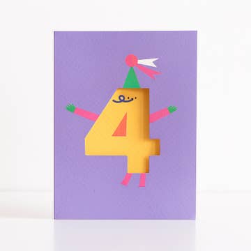 Rumble Cards x Ashley Le Quere - Digitally printed - 300 gsm Tintoretto Gesso - Die Cut Finish - Brown Envelope - Size: A6 (105 x 148 mm or 4.1 x 5.8 inches) - Blank Inside Let's celebrate turning four in style with our 'Age 4 Greeting Card', beautifully designed in collaboration between Rumble Cards and Ashley Le Quere. This card features a lively number four character sporting a cute party hat, ready to jump into the birthday festivities, all set against a lovely purple backdrop. Each card is digitally printed on top-quality 300 gsm Tintoretto Gesso paper, known for its nice textured feel, adding a touch of luxury to your birthday greetings. With its eye-catching die-cut finish, the card stands out as a memorable birthday keepsake. The A6 size (105 x 148 mm or 4.1 x 5.8 inches) is perfect for sending your best wishes and comes with a brown recycled envelope, ensuring our commitment to the environment remains strong.