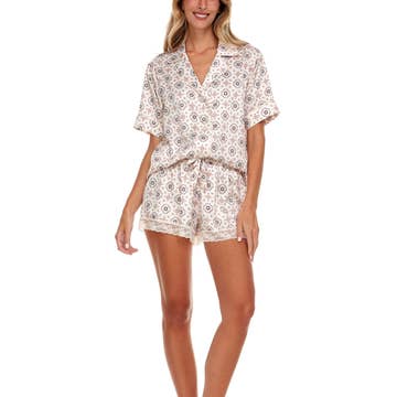 Sweet dreams await in these soft, satiny charmeuse pajamas that pair a classic button-up top with matching lace-trimmed shorts. 100% polyester. Hand wash, dry flat. Imported. #Q81461