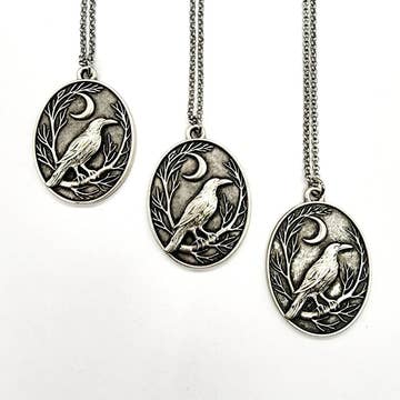 Raven and Crescent Moon Antique Silver Pendant complete on an 18” stainless steel chain. Discover a piece that whispers of mystery and nature. This antique-inspired copper pendant features a beautifully detailed raven perched beneath a crescent moon, encircled by delicate branches. Perfect for lovers of the mystical and symbolic, this necklace evokes freedom, transformation, and the quiet strength of nature's nocturnal beauty. This pendant measure 1.75" x 1.10" Perfect For: Nature lovers, dreamers, and seekers of symbolism A meaningful gift for birthdays, anniversaries, or spiritual milestones Gothic, bohemian, or witchy style enthusiasts Add this unique and enchanting necklace to your collection or gift it to someone who finds beauty in the night.