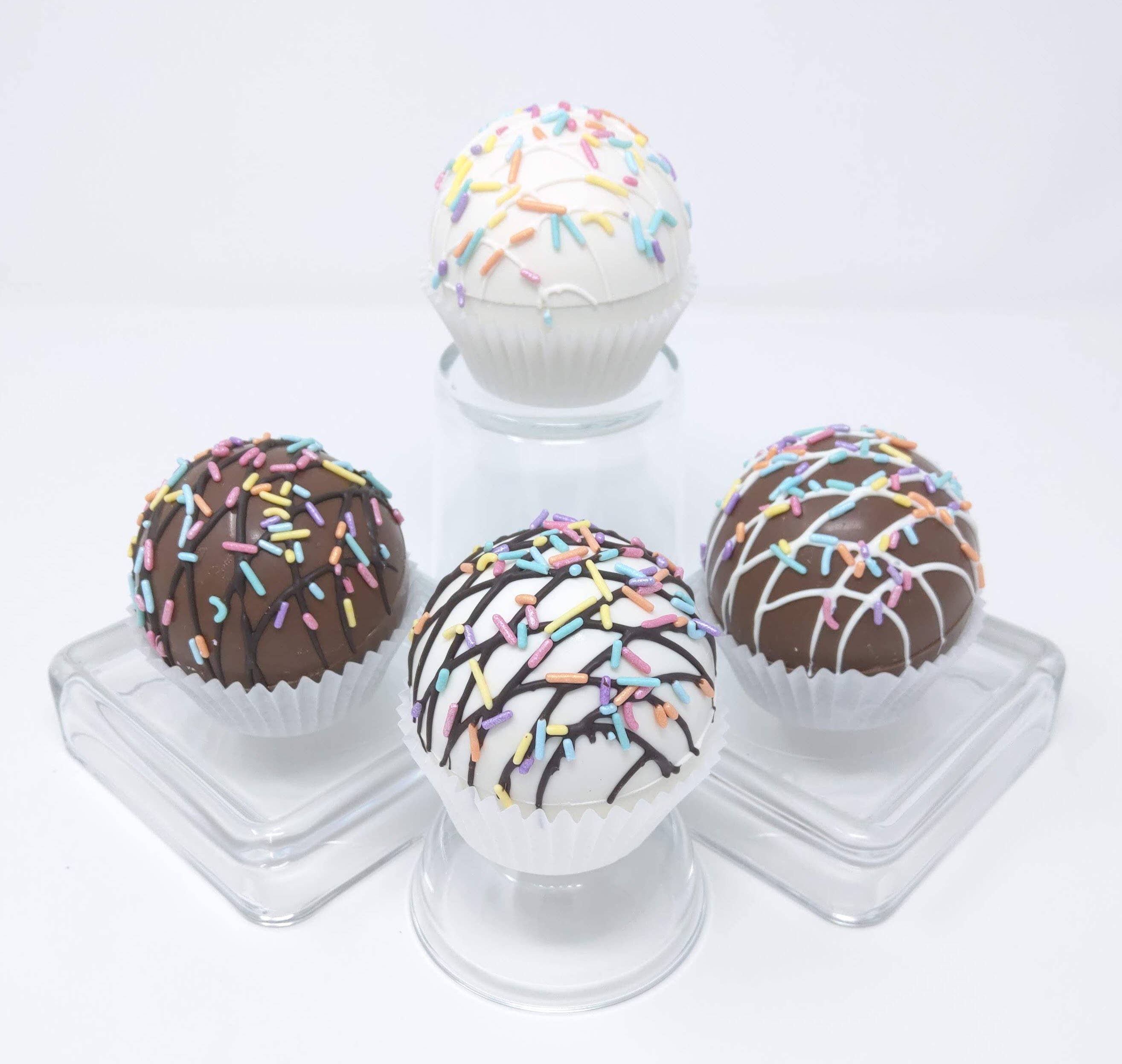 Join our Cake Pops Rewards Program! It's easy... just buy some cake pops or cakesicles at regular price! You'll get a $20 credit after each 20 dozen purchased within a 3 month period - it's that easy! THIS ITEM SHIPS UPS 2-DAY AIR IN THE USA (IF GROUND SHIPPING IS MORE THAN 2 DAYS). Shipping includes insulation and ice pack(s). Wild Angel cake crumbs mixed with a chocolate ganache and covered with gourmet confectionery chocolate! Decorated with a mini peanut butter cup, premium sprinkles, and vanilla candy. The perfect moist, sweet, cake pop! Handcrafted & decorated, individually wrapped in food-safe plastic bag, twist tie, Wild Angel Treats sticker. Sold in sets of 12. Shelf life: room temp - 1 week, chilled - 2 weeks, refrigerated - 3 weeks, frozen - up to 6 months