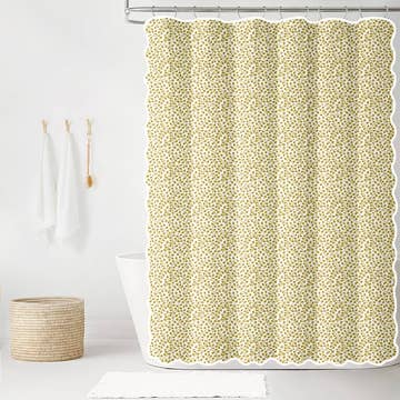 Our scalloped edge shower curtains bring a finished touch to any bathroom. Pair them with the coordinating (or matching) wallpaper and cafe curtains and you've got a whole beautiful designer vibe! Made in the USA! Polyester (which is a great material for a shower curtain). We recommend an additional liner for a longer life of our curtains. Curtains are 72" wide (standard) and come in 3 lengths (72", 84", 96") w/ button holes, white banding on scalloped edge. Scale on mockup image is approximate to the best of our abilities. Top of curtain is straight, not scalloped. Shower curtains are made to order and may take up to 6 weeks to produce.