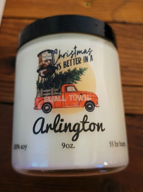 Celebrate Christmas in the small town with this vintage truck and water tower customized with your town name. Select your scent from our more than 40 fragrant candle scents. This is a 4-oz tin candle hand-poured with 100% soy and an estimated burn time of 25+ hours. See other items in our shop for this same label in a 6, 9 or 16-oz jar!