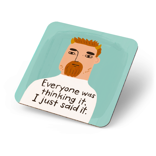 Finally, a coaster for the hero-slash-menace who blurts out the stuff everyone else is too polite to say. Featuring a smug-looking bloke and the brutally honest words “Everyone was thinking it, I just said it,” this cork-backed hardboard gem is perfect for truth bombs, awkward silences, and pissing off your in-laws at Sunday lunch. * Cork backing to keep it steady while you stir the pot * Hardboard top tough enough for beers, wines, coffees, or your third “accidental” gin * Ideal gift for that mate who’s got no filter and no shame (aka your spirit animal) Basically, it’s the coaster equivalent of calling bullshit out loud — and then raising a glass to it. Premium drink coaster details * 10cm x 10cm * 3.17mm thick hardboard coaster * Premium Gloss finish * Cork Back