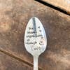 Hand stamped “the secret ingredient is always love” spoon with a mason jar and little hearts. This is for ONE spoon. These are vintage spoons so there will be imperfections! They may not resemble the same spoons in the picture either as those are examples. They are hammered and stamped with the wording. Spoons will vary in size. color and metal (meaning patina or tarnish). Each spoon will be different which adds to the uniqueness of this set. PLEASE NOTE! These are very old spoons and should be wiped clean with a damp rag. They should not be placed in the dishwasher or be soaked in any water as it can ruin the metal/ wording. Every effort is made to ensure the item you receive matches the photos displayed, there may be some slight variations. Variations in color may also occur based on computer monitor settings.