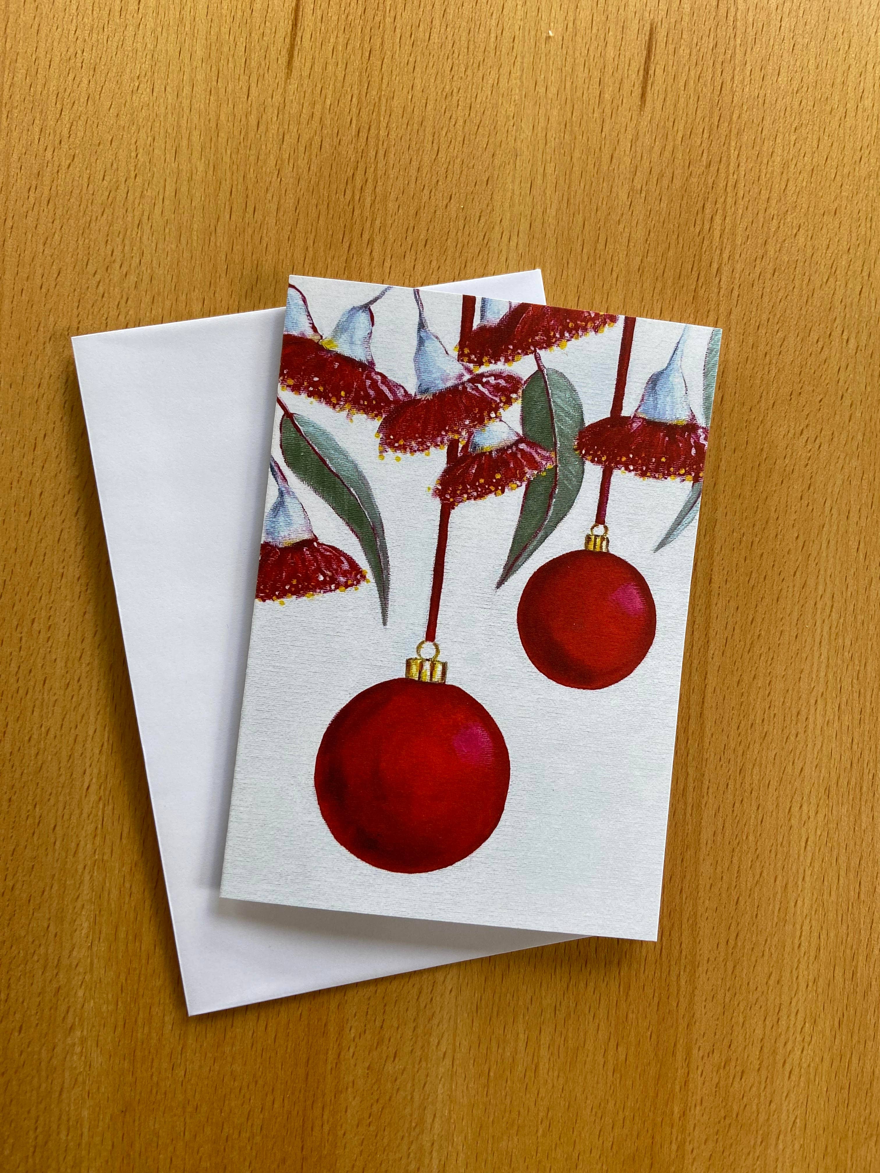 Christmas Greeting card of an iconic Australian magpie with a red bauble in its beak, printed from an original painting in acrylics on canvas, this card is 105mm x 148mm, designed and printed in Australia on 100% recycled premium stock, with white envelope, with a cello bag. Blank inside for customer's message.