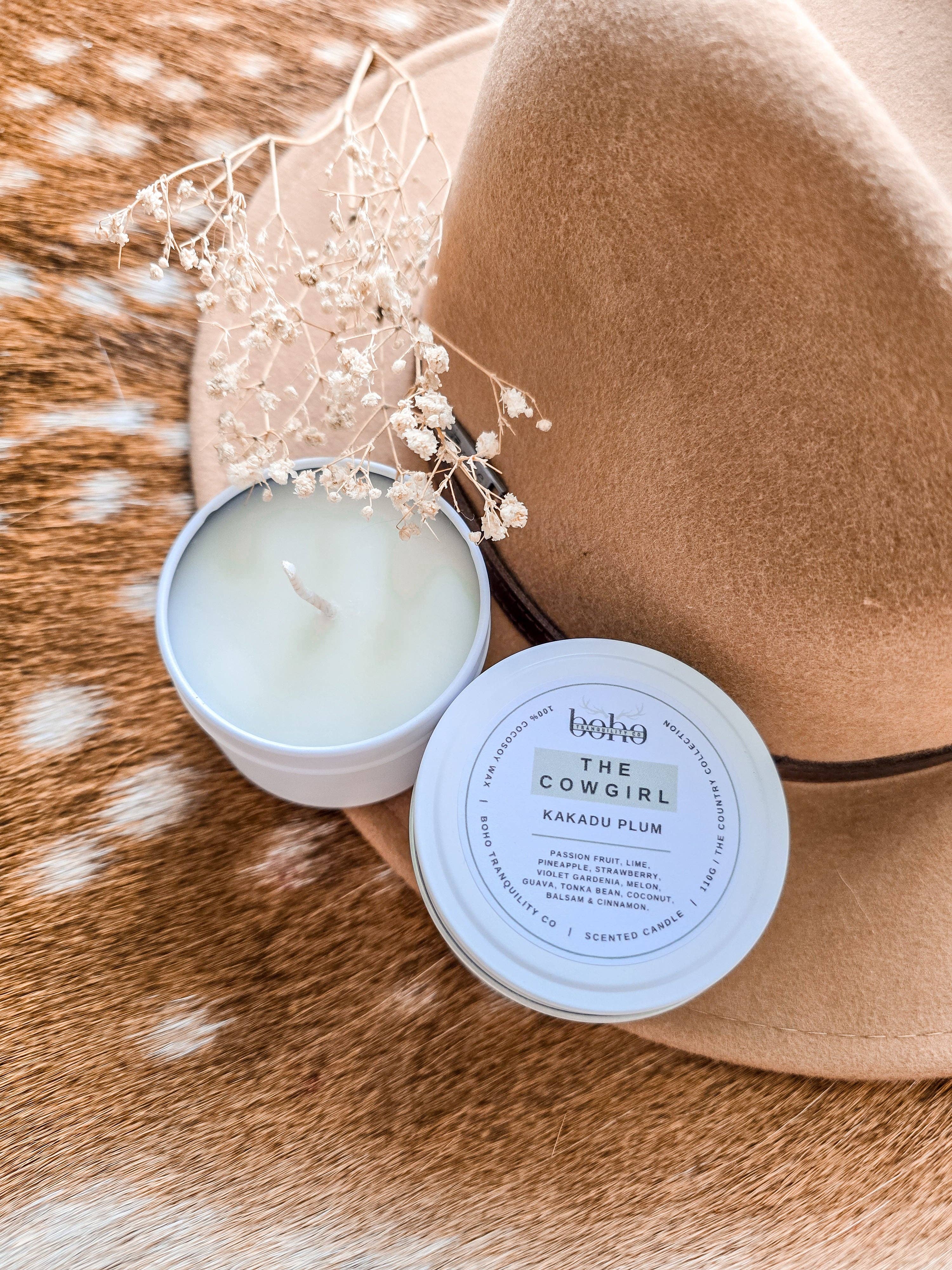 Made in Australia Burn time: 20 hours Handmade: Yes Material: Tin Size: 110 g Wax type: Coconut, soy Wick material: Cotton