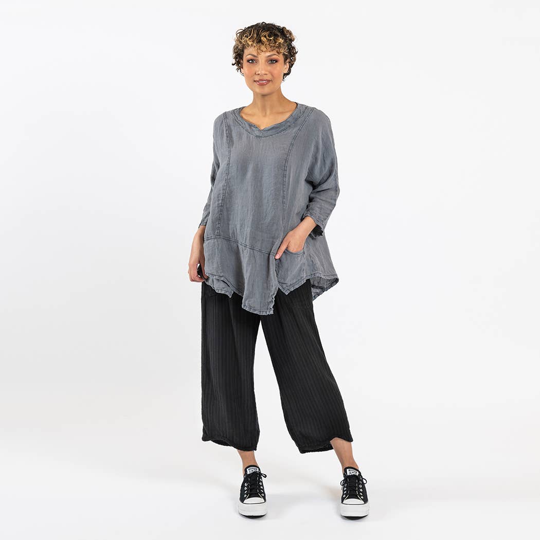 Modern, yet timeless. Natural, yet edgy. Effortless. Cynthia Ashby pieces are comfortable – as comfortable as the women who wear them are in their own skins. Confident, fashion-forward, mysterious, maybe. Constructed with high-quality linen, cotton, and the occasional synthetic in assorted textures and weights, each piece is dyed for an effect of uncommon depth and texture. A California native transplanted to Chicago, she earned a B.F.A. from the School of the Art Institute, and at the same time, taught herself how to design apparel. She applied her exuberance, creativity, and curiosity, playing with different fibers, materials, dye techniques, construction until she found her inimitable aesthetic. Just out of college, she launched her first official clothing line, securing several local boutiques who appreciated her superior craftsmanship and unique point of view. A brand was born. Today, Cynthia Ashby Designs are featured in 200+ stores in the U.S., Canada, and Australia.