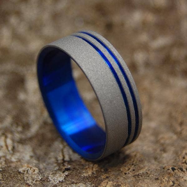 Anyone walking into a shop full of loud, over-sized machines would never guess the strong, naturally inspired wedding rings that are being made. Each ring is individually hand-made, careful attention to detail, and a finished product that is certain to feel as much a part of their love years down the road as it did on the day they married. Scott is a self-taught metal artist who spent a number of years designing knives while making rings as gifts for friends and family. When he married me, wife and business partner Minter, rings and romance won out. Minter & Richter Designs now runs out of a shop and studio in Boston, MA, where we also live with our two young sons and dog Ruby. Because the widespread use of titanium for jewelry has only taken off in the last two decades, some people consider titanium wedding bands rather non-traditional. But what could be more traditional than a ring that will maintain its shining strength and beauty generations beyond gold and silver? And starting a new tradition that doesn’t fuel civil wars (diamond trade) or destroy ecosystems (gold mining) sounds like a good place to start.